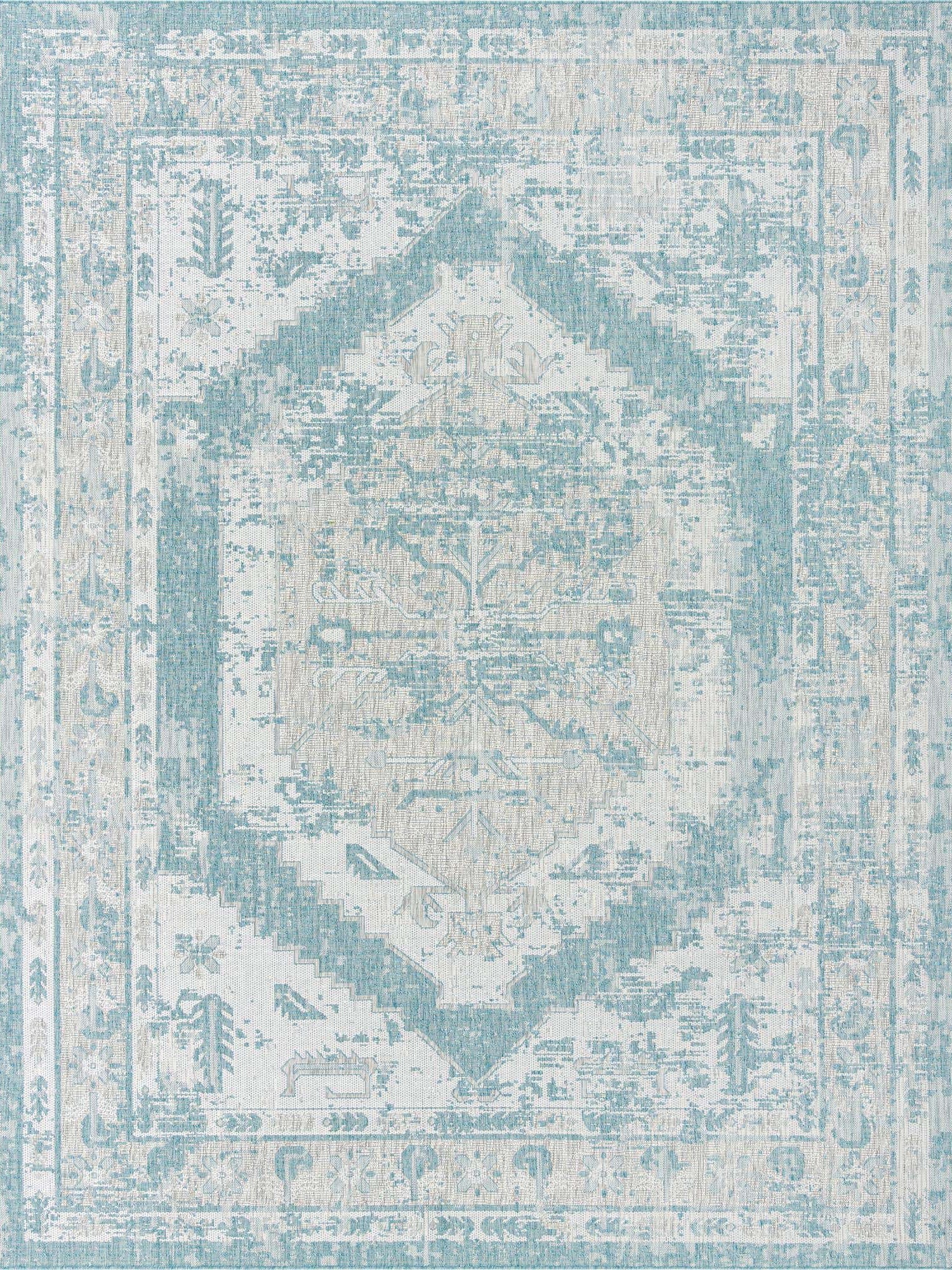Aqua 9' x 12' Outdoor Traditional Rectangle Area Rug Weather Resistant for Patio, Deck, Terrace, Balcony, Porch