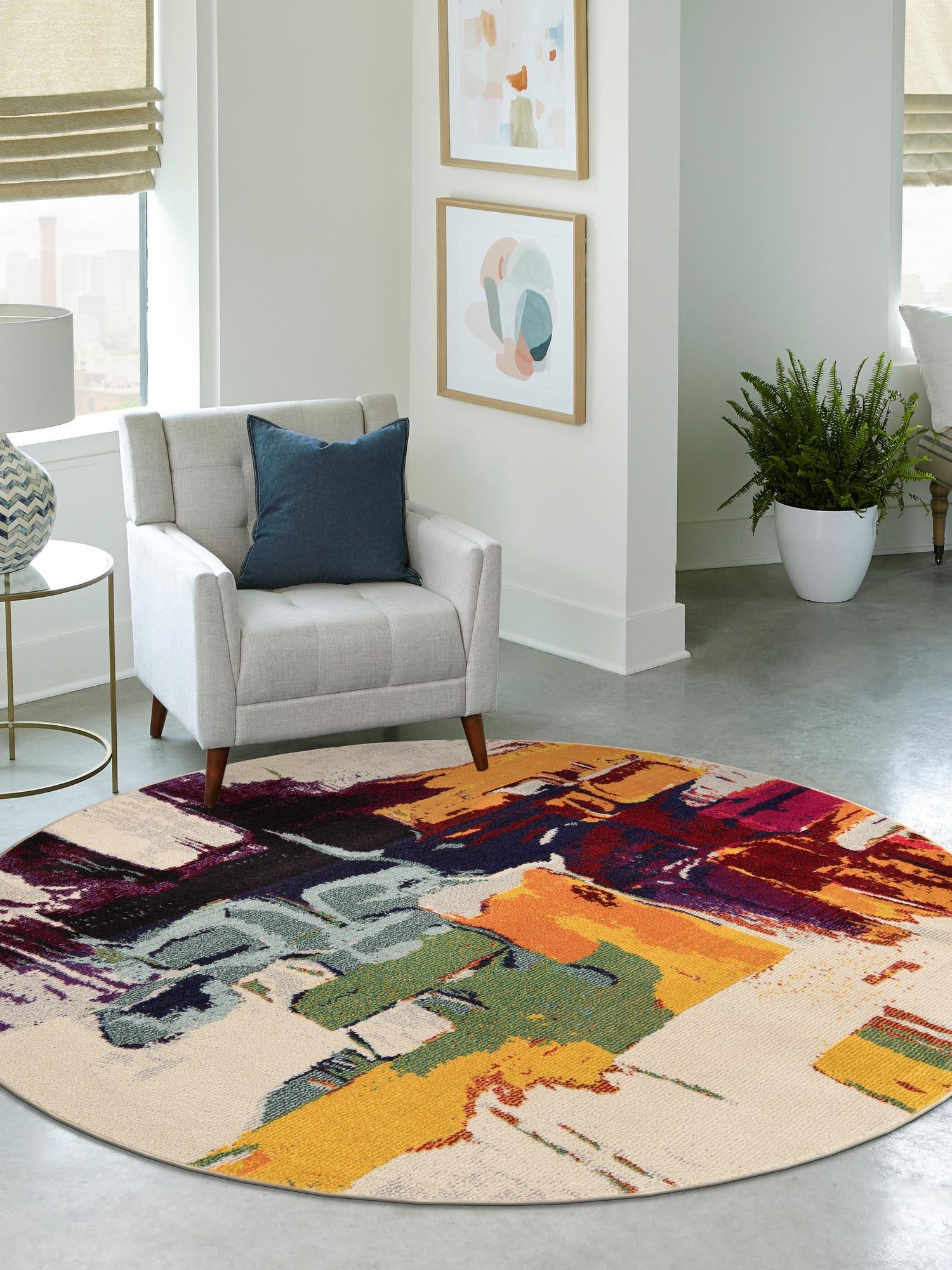 Beige 6' 1 x 6' 1 Estrella Round Area Rug 100% Polypropylene Non-Shedding Stain Resistant Carpet Colorful Modern Abstract Design Easy Clean for Home Decor