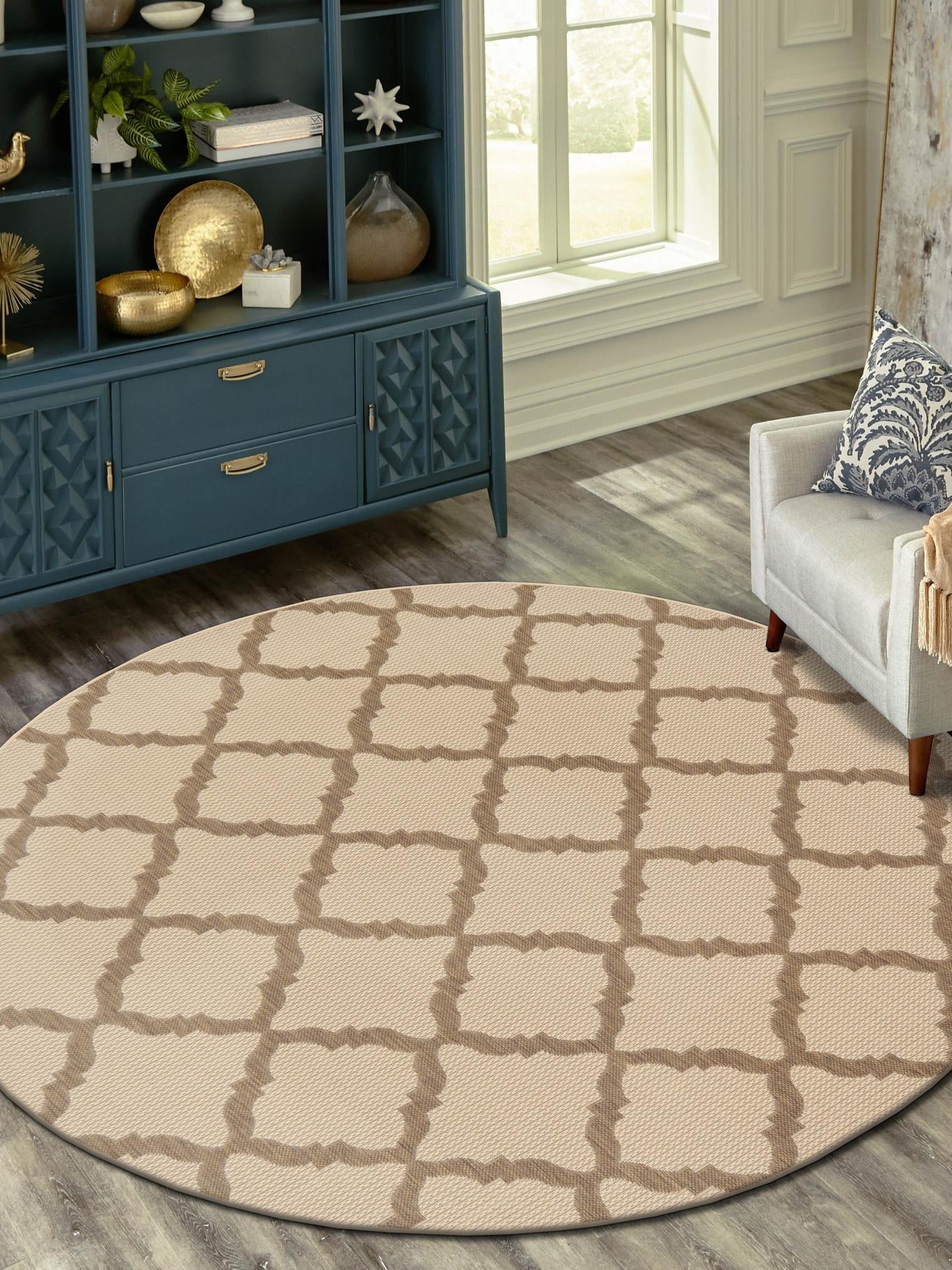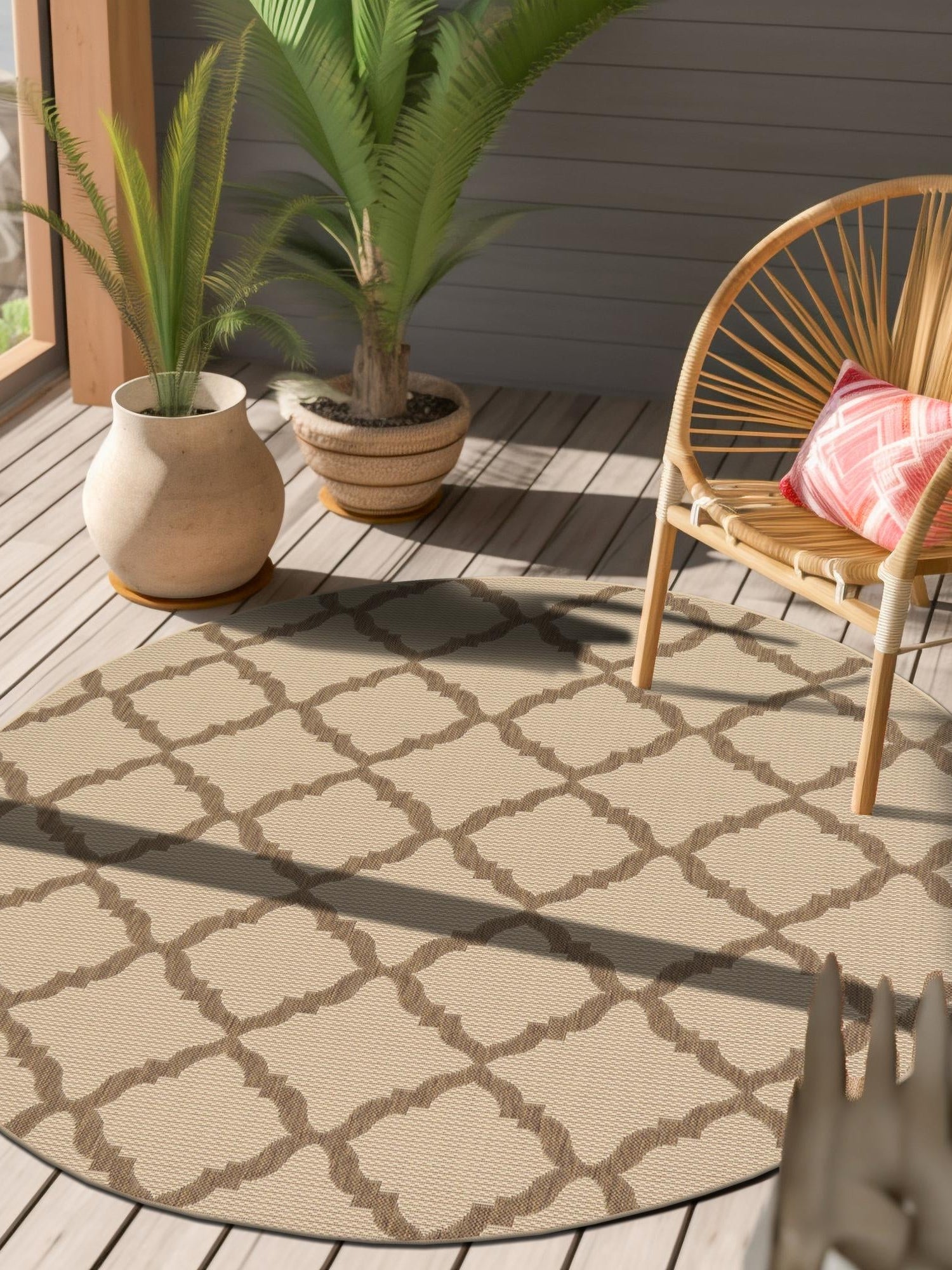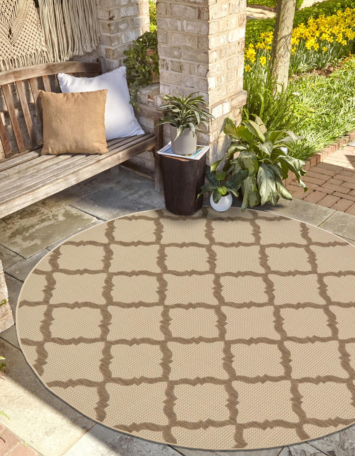 Beige 6' 1 x 6' 1 Outdoor Trellis Round Area Rug Weather Resistant for Patio, Deck, Terrace, Balcony, Porch