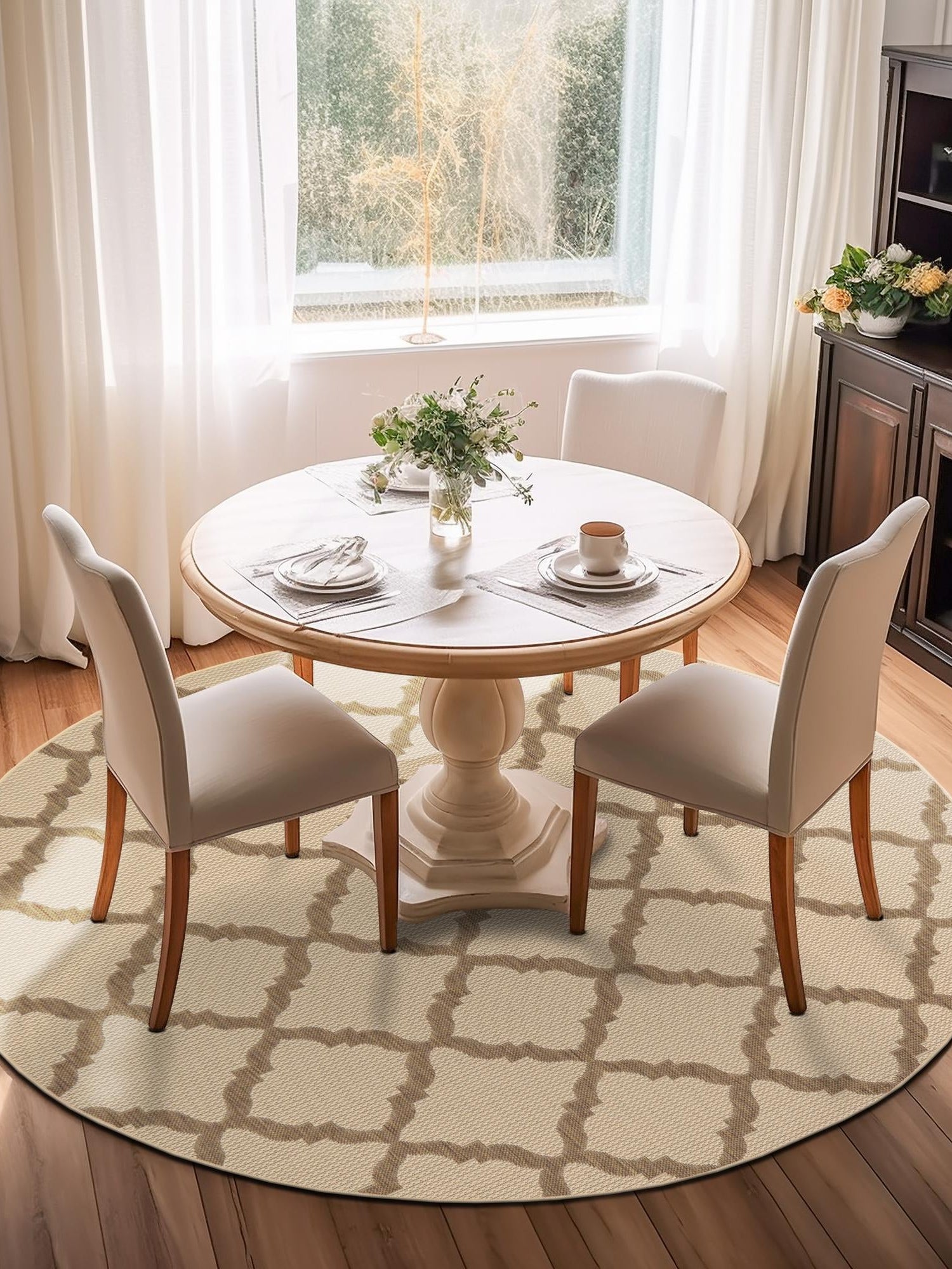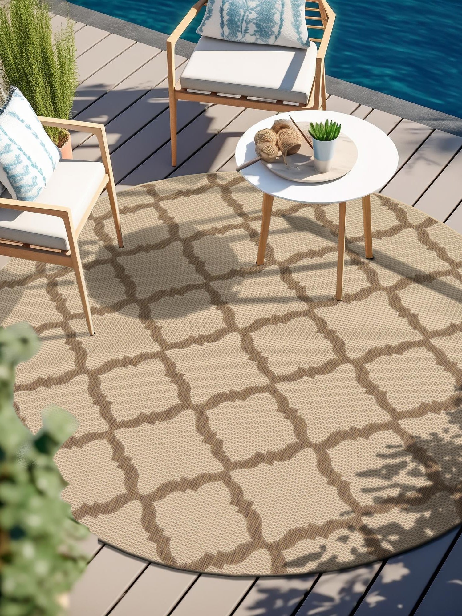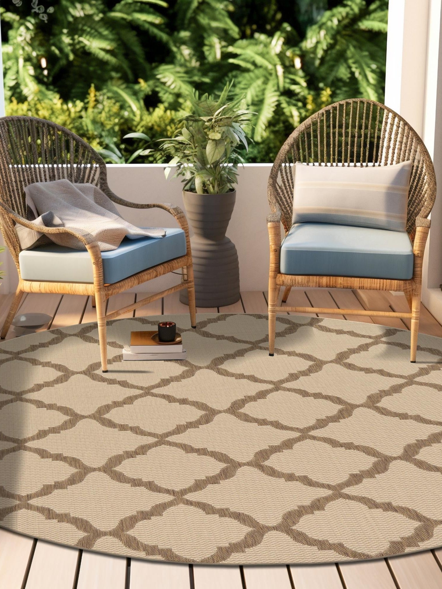 Beige 6' 1 x 6' 1 Outdoor Trellis Round Area Rug Weather Resistant for Patio, Deck, Terrace, Balcony, Porch