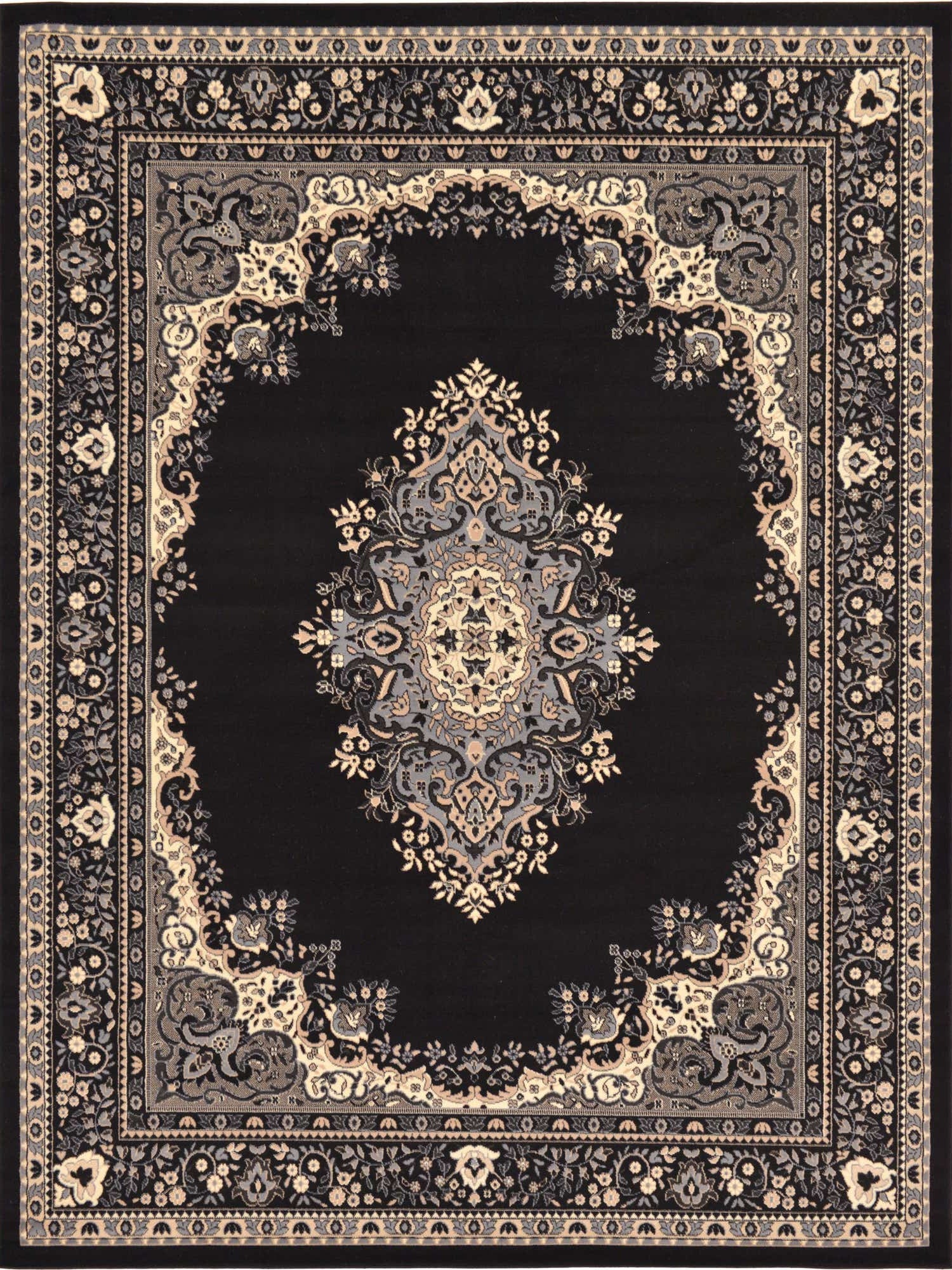 Black 9' x 12' Reza Rectangle Area Rug 100% Polypropylene Easy Clean Traditional Motif Classic Carpet for Home Interiors
