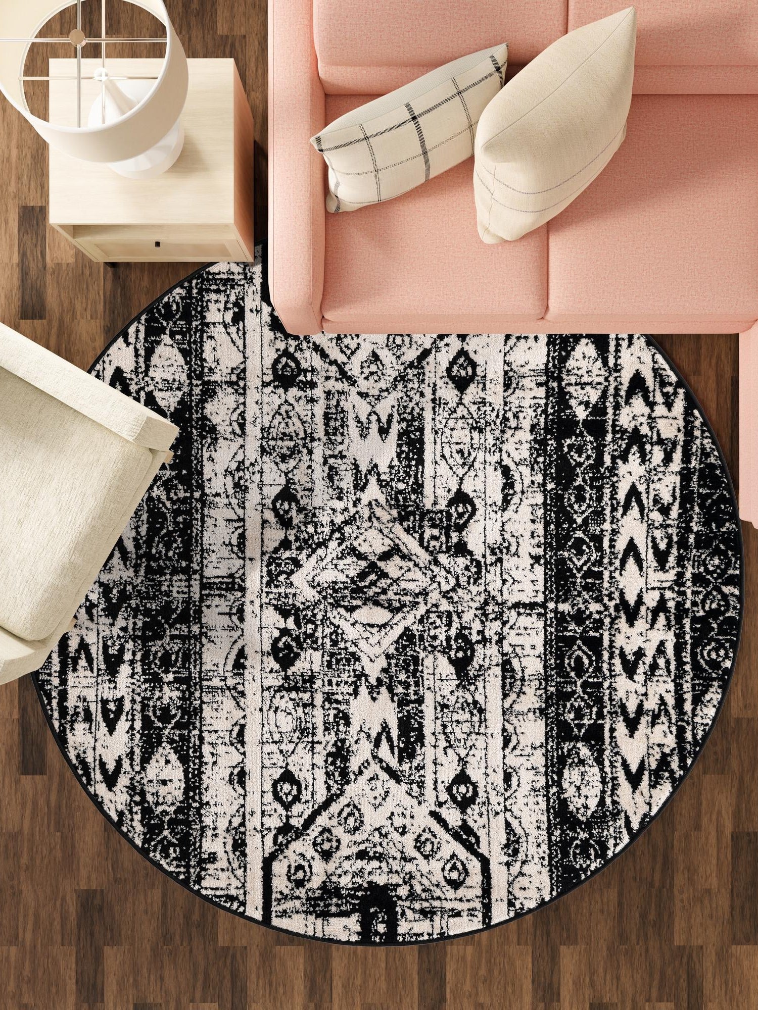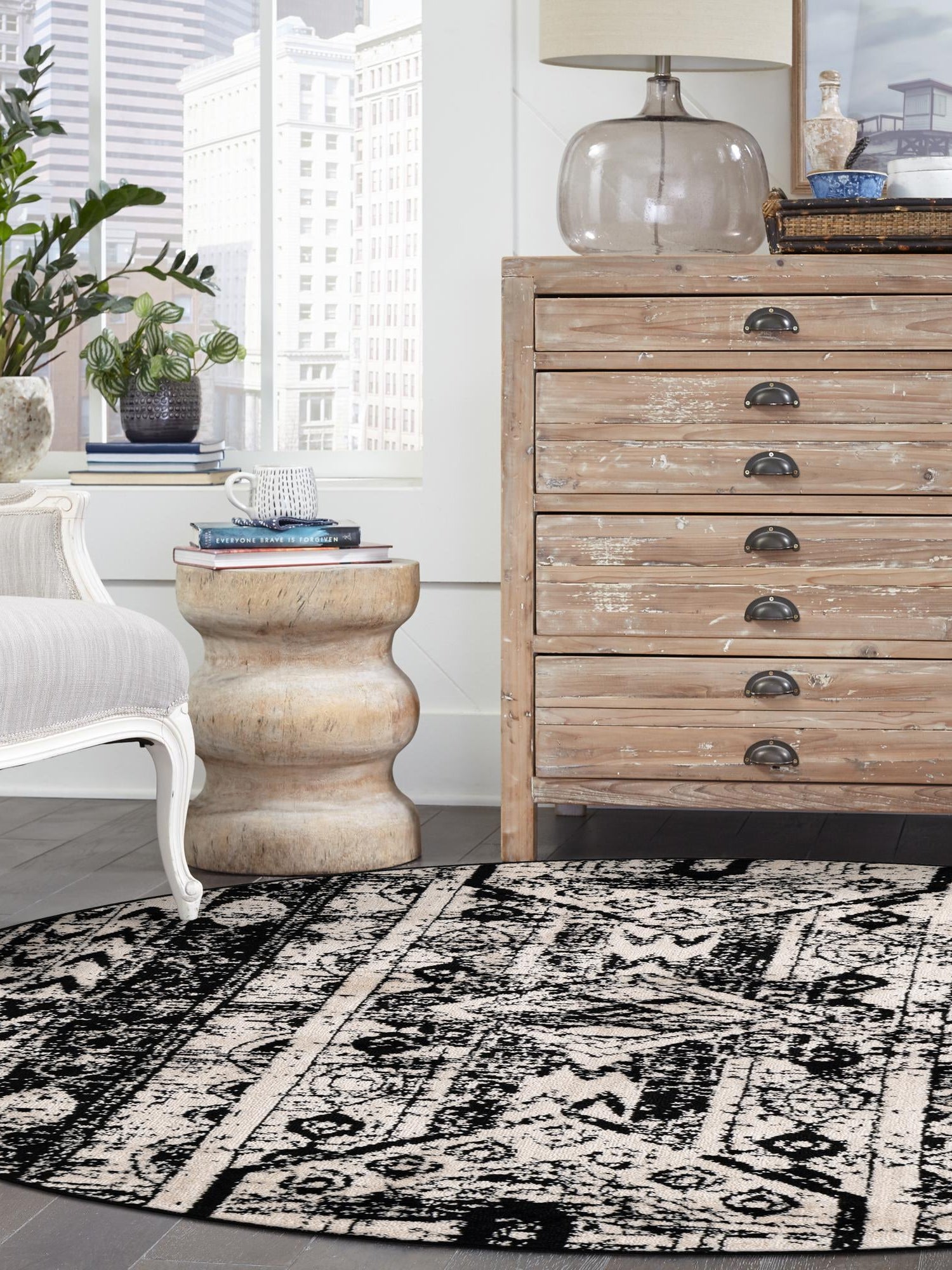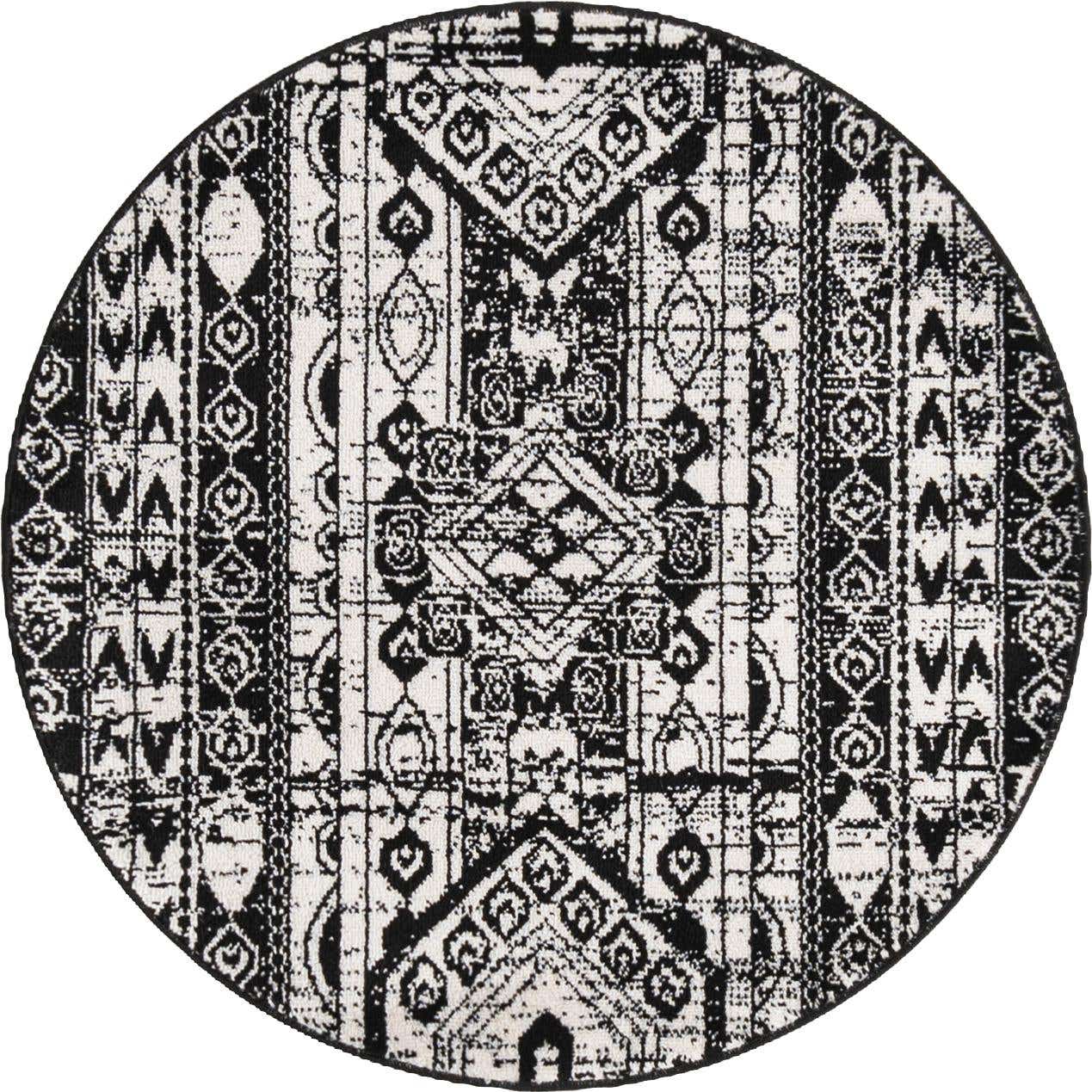 Black and White 3' 1 x 3' 1 Portland Round Area Rug 85% Polypropylene & 15% Polyester Vintage Distressed Traditional Carpet for Home Decor