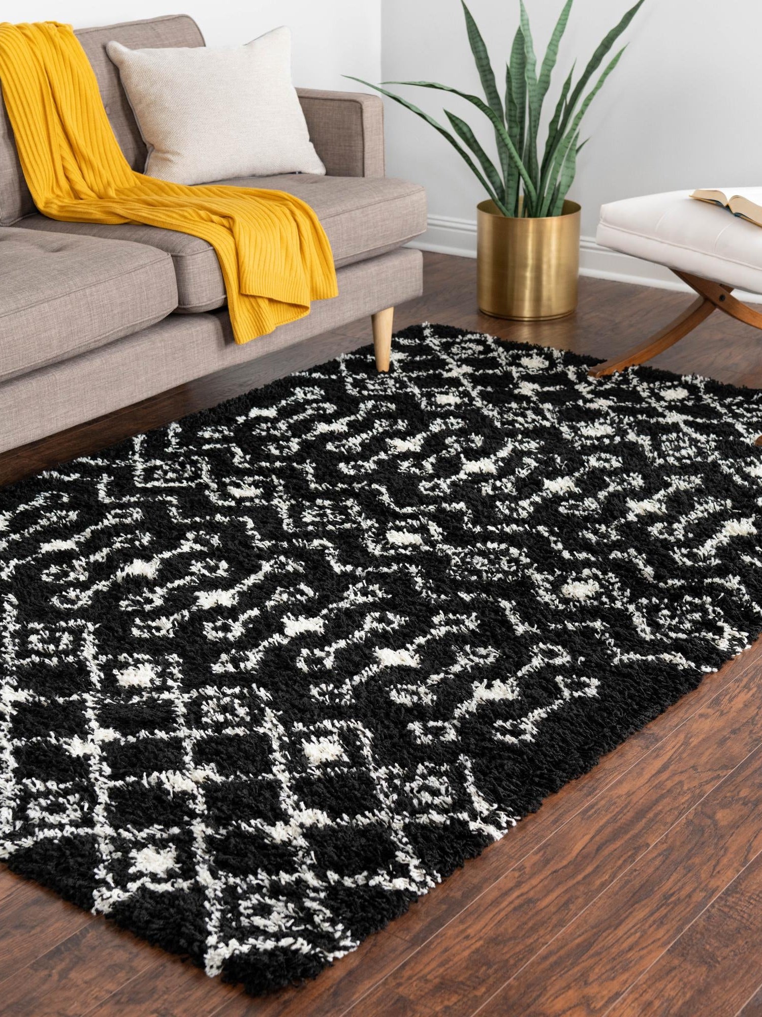 - Chic Black and White Color Scheme: The classic black and white color combination adds a touch of sophistication and versatility. This rug complements a variety of interior styles, ranging from modern to traditional. Use it as a statement piece or a subtle backdrop to showcase your decor.