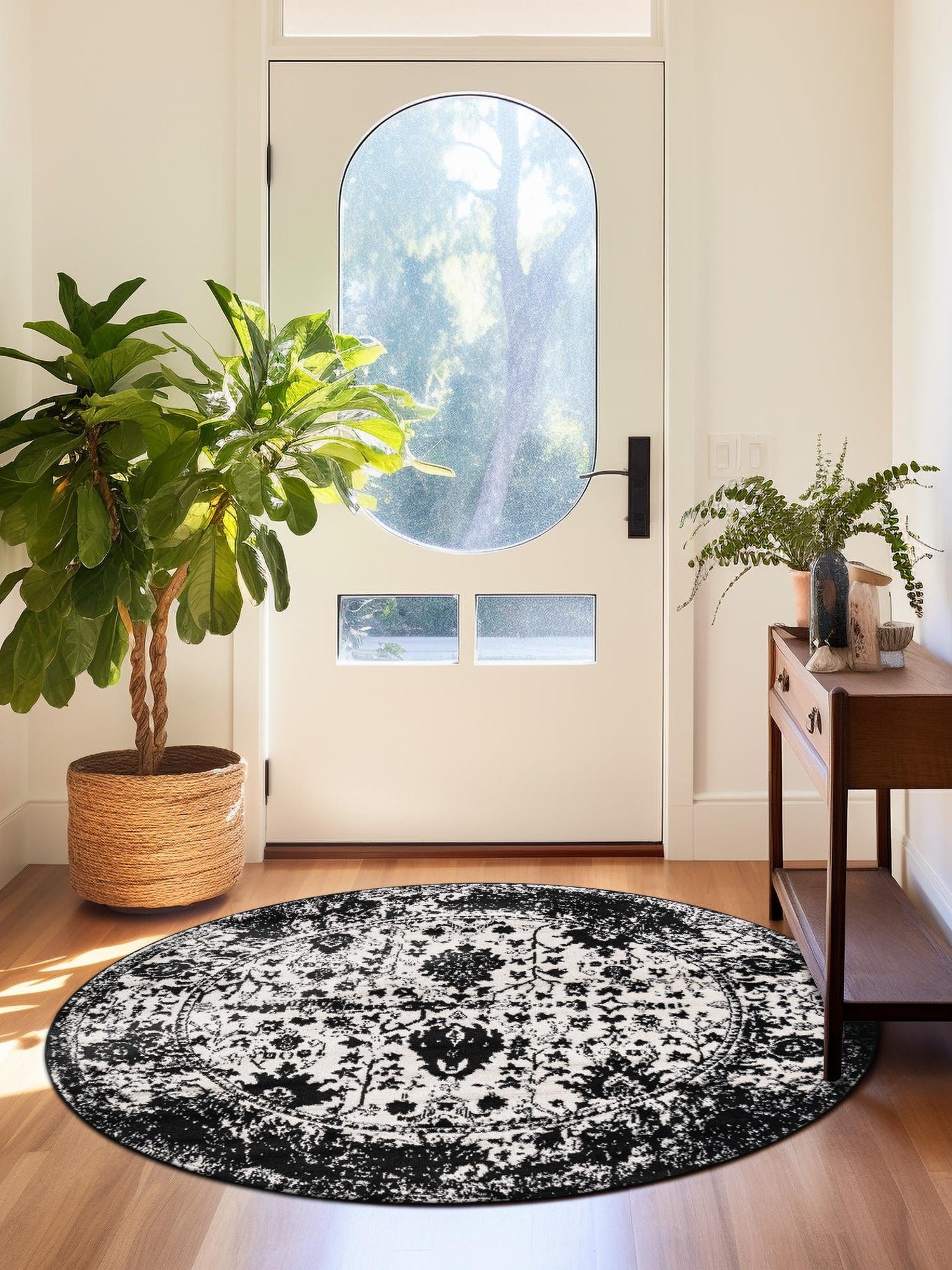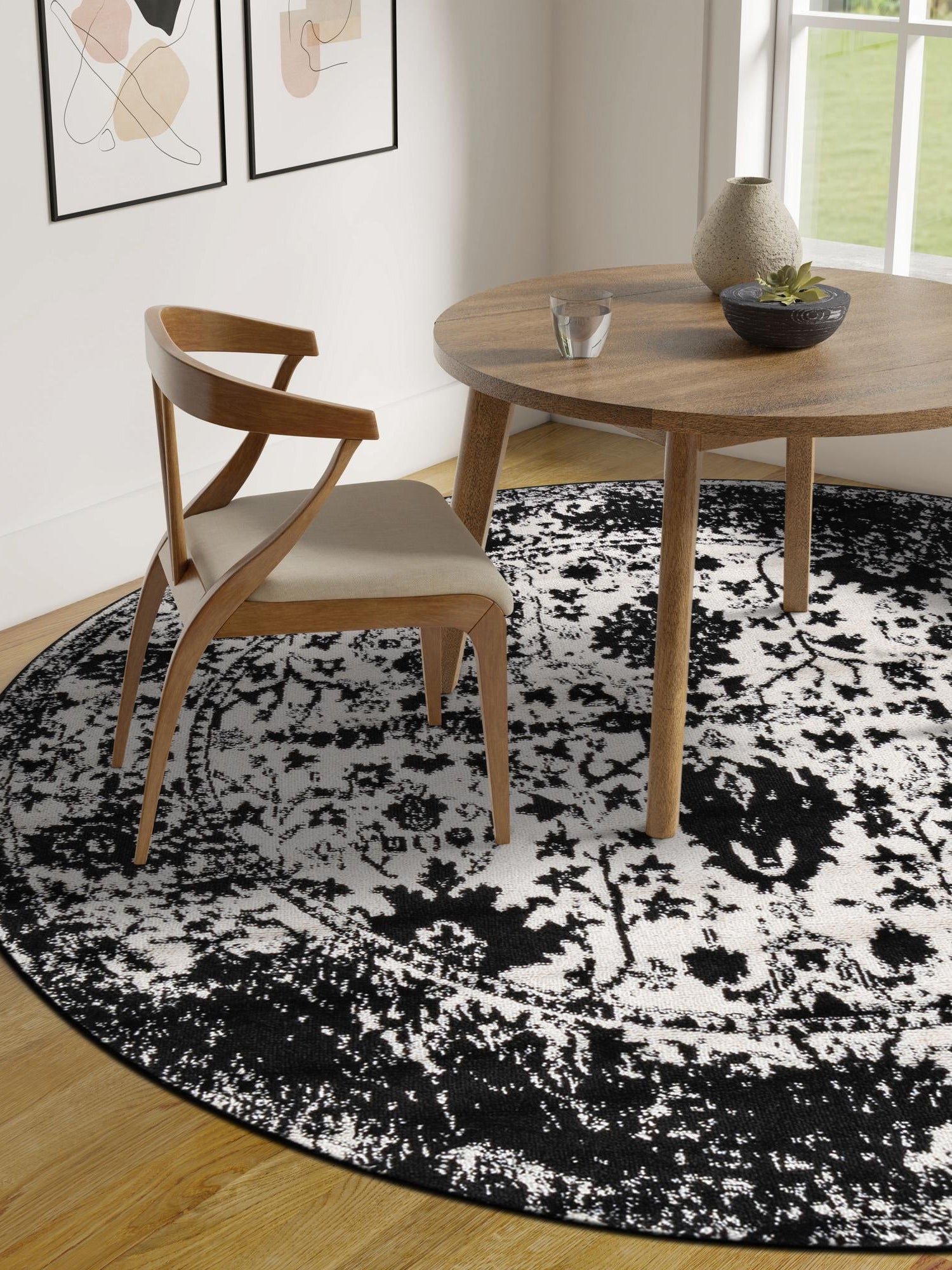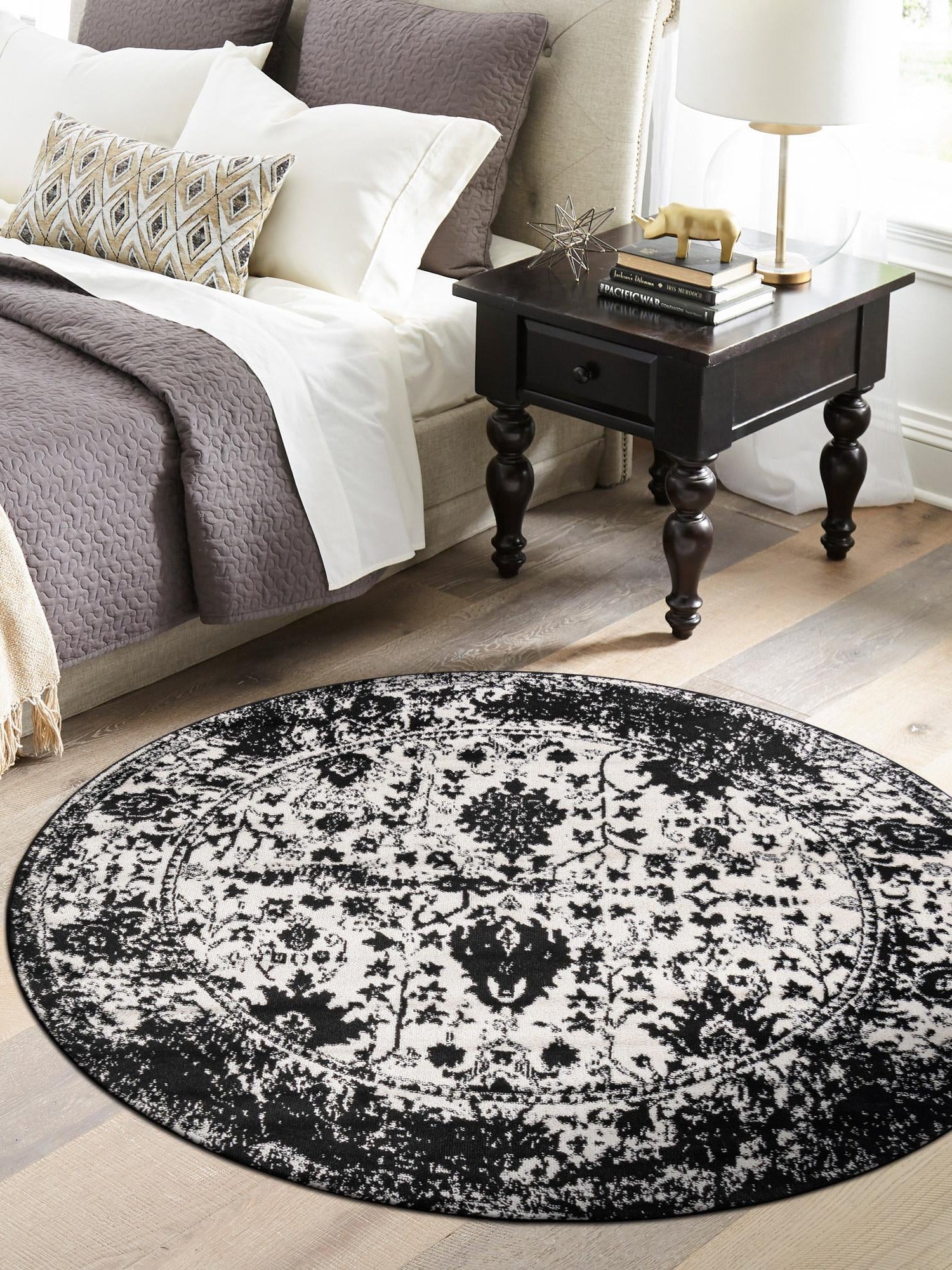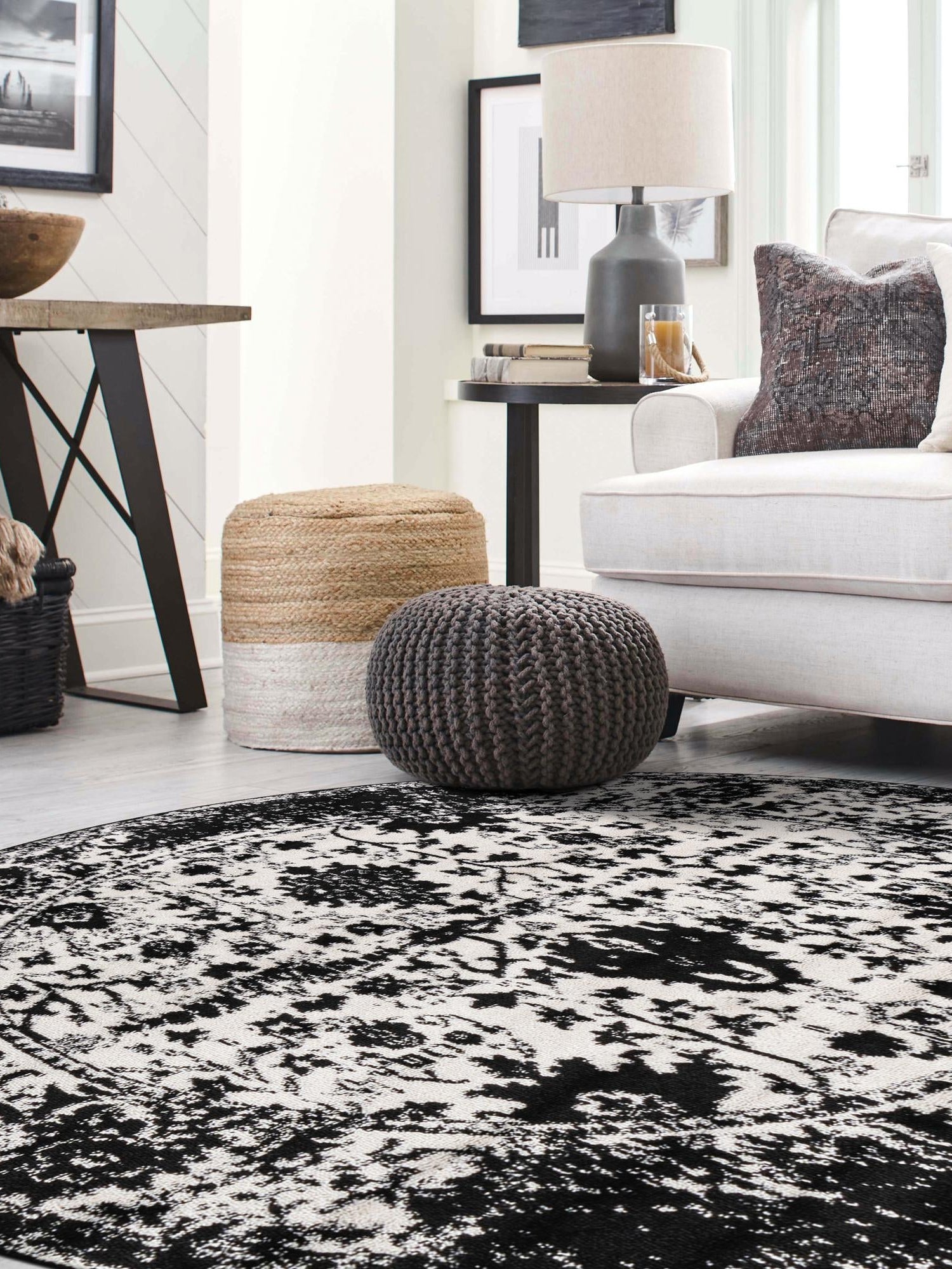 Black and White 7' 1 x 7' 1 Portland Round Area Rug 85% Polypropylene & 15% Polyester Vintage Distressed Traditional Carpet for Home Decor