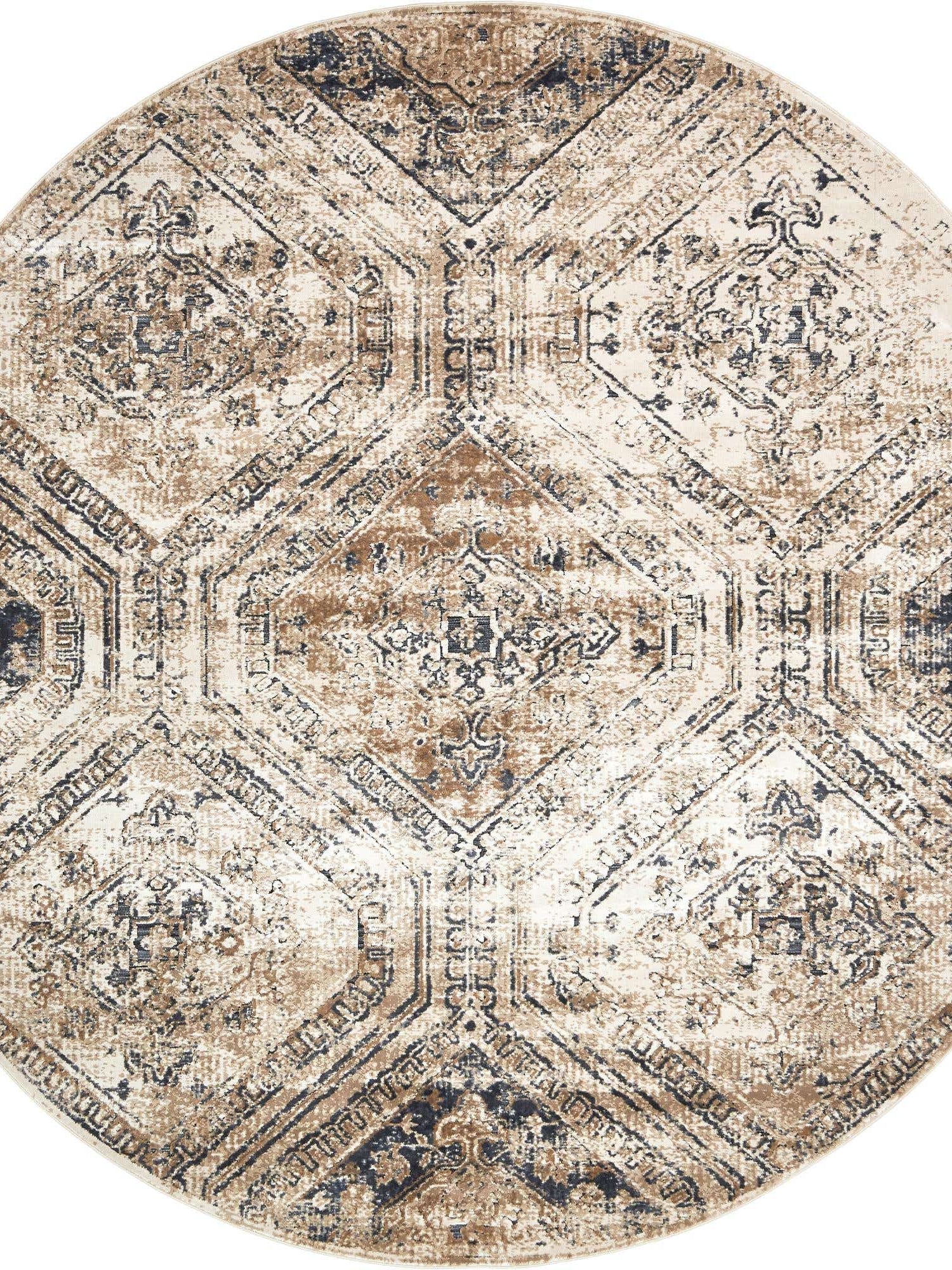 Blue Beige 7' 10 x 7' 10 Chateau Round Area Rug 85% Polypropylene & 15% Chenille With Cotton Backing Traditional Vintage Distressed Carpet for Classical Interior Design Decorating