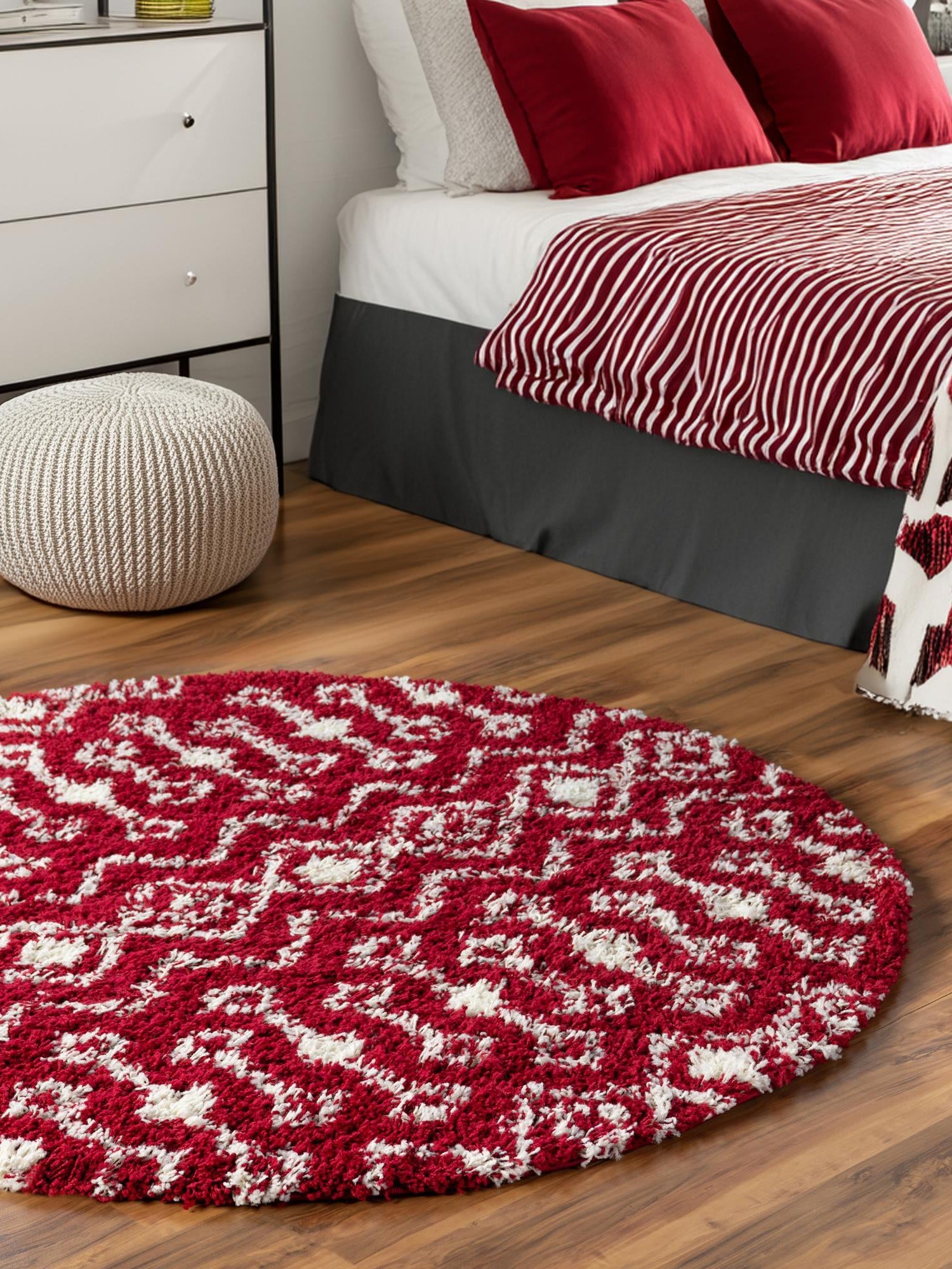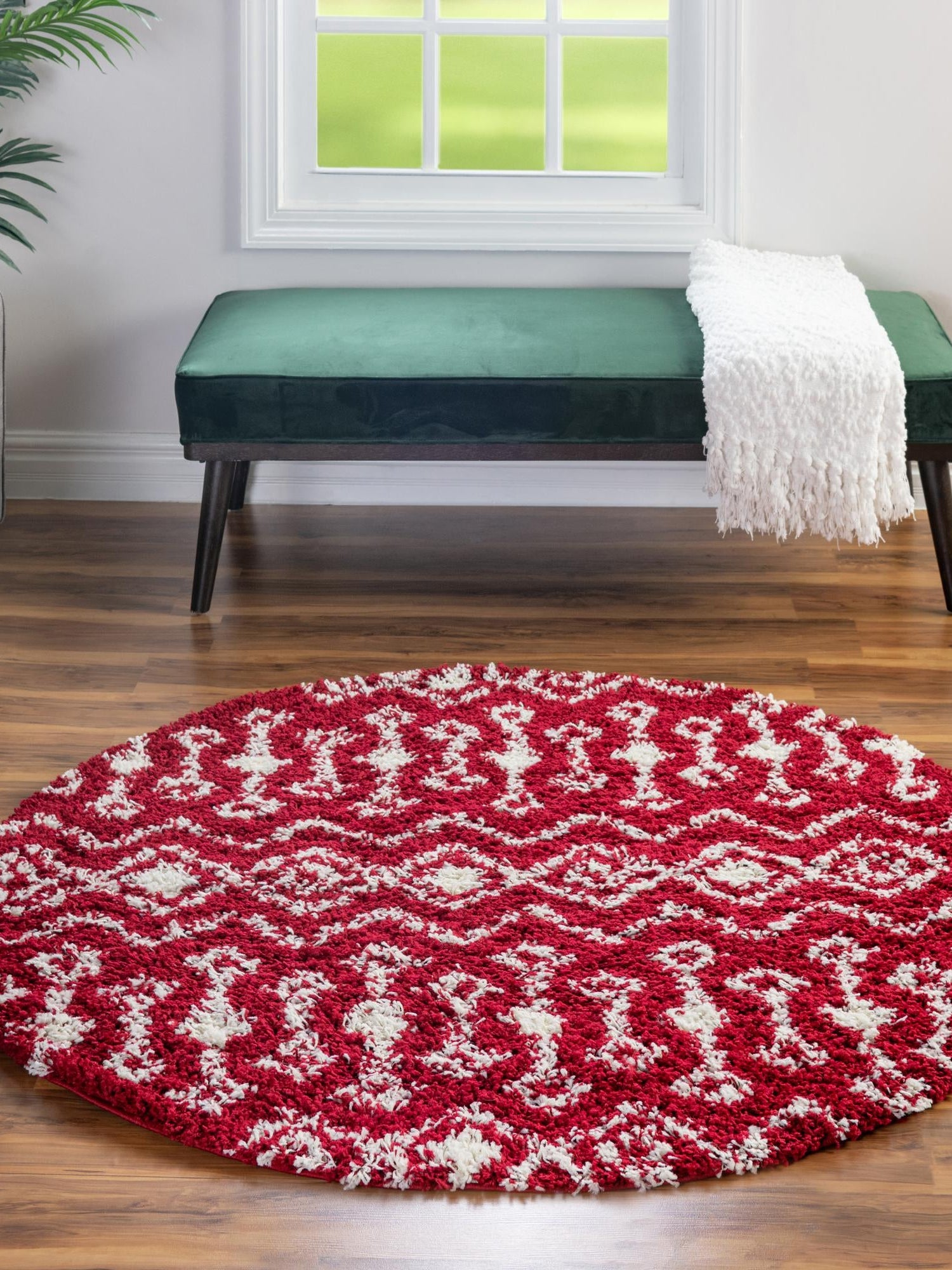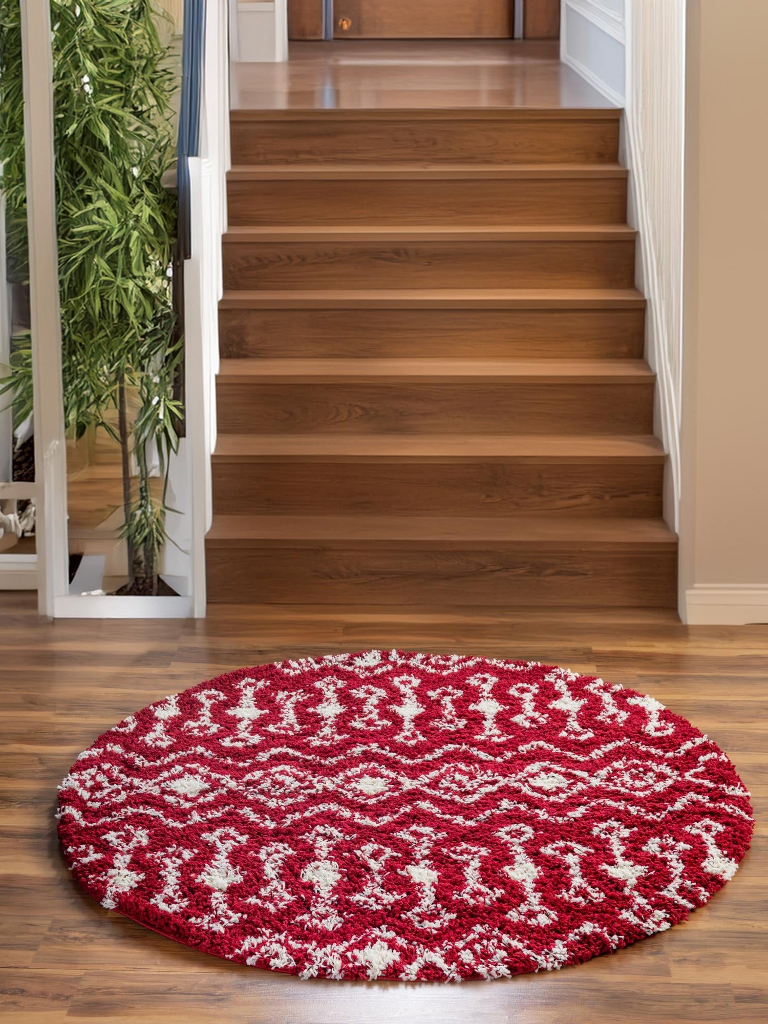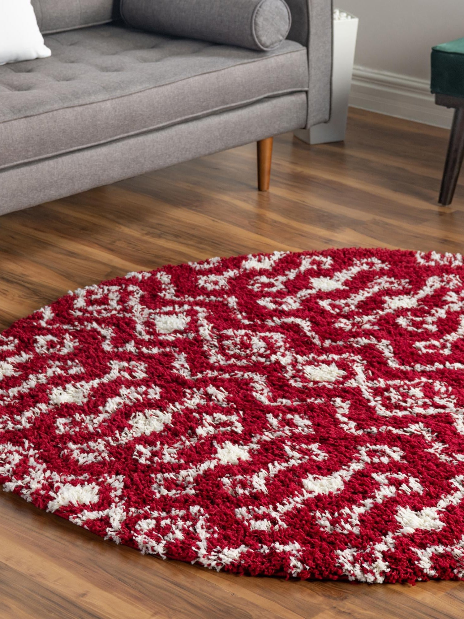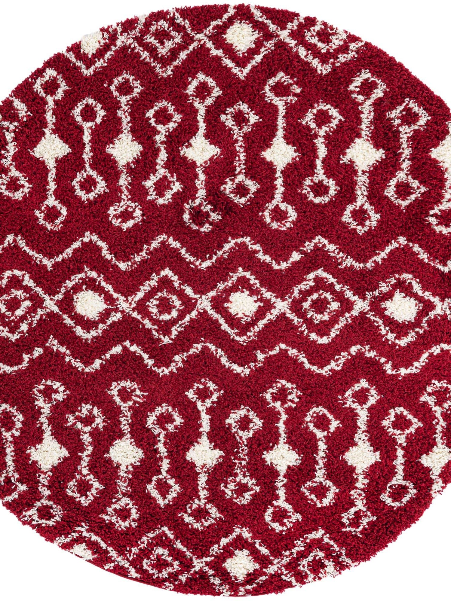 Burgundy Red 6' 1 x 6' 1 Moroccan Trellis Shag Round Area Rug Thick Soft Touch Fluffy & Plush Shaggy Pile