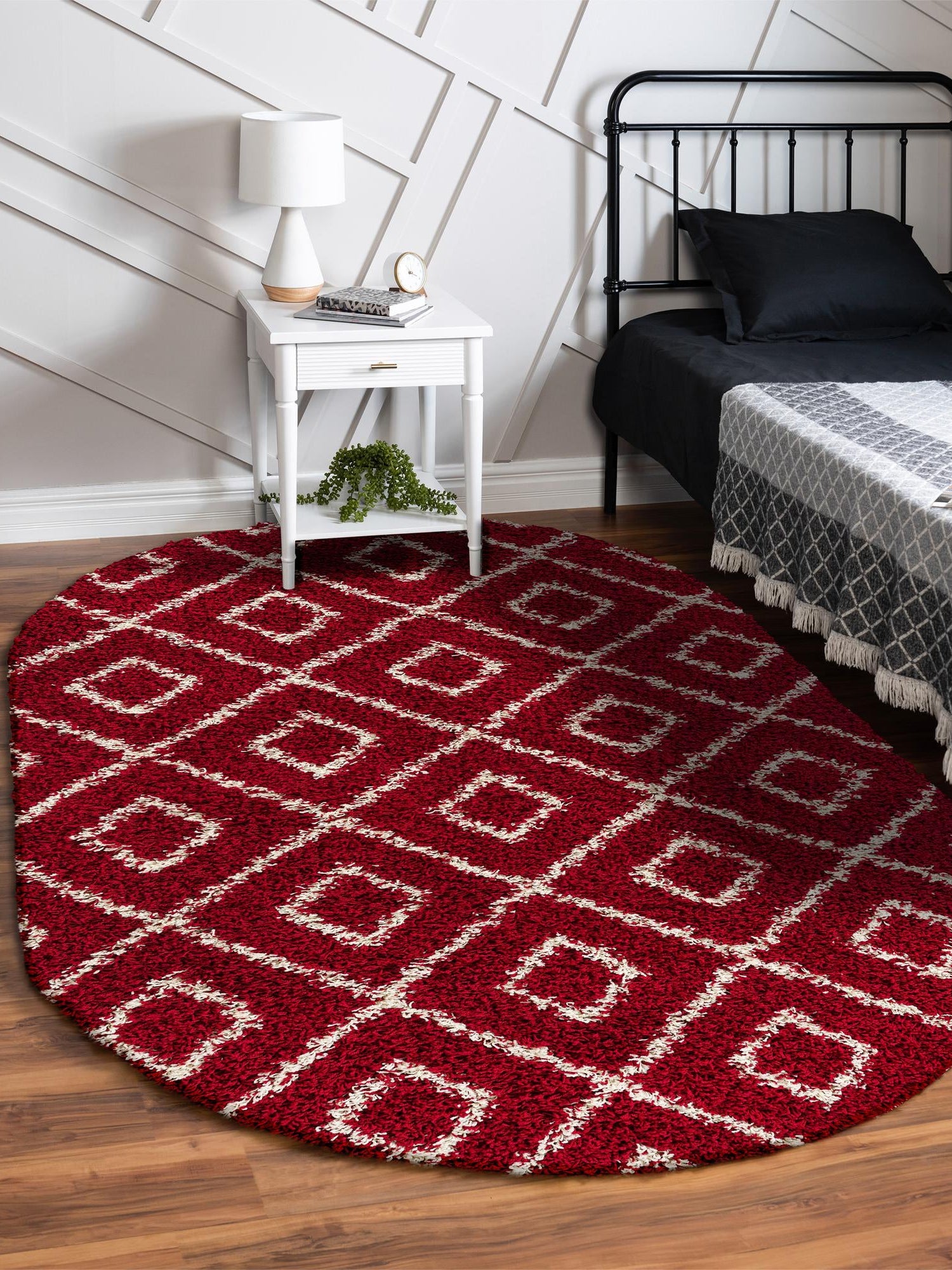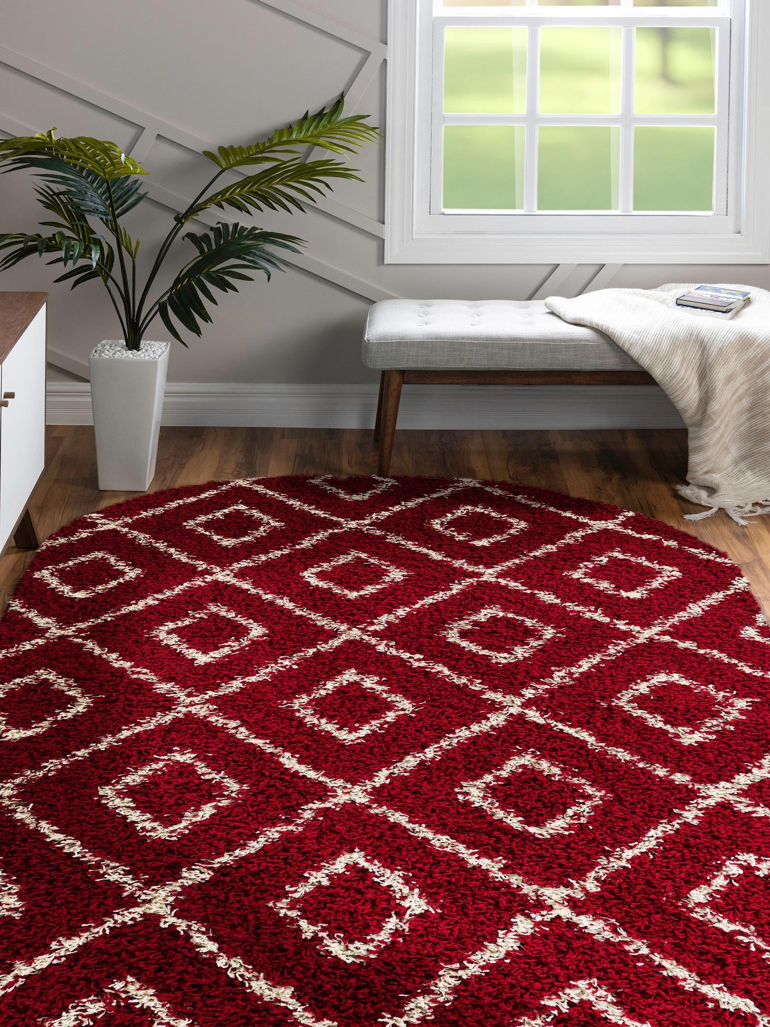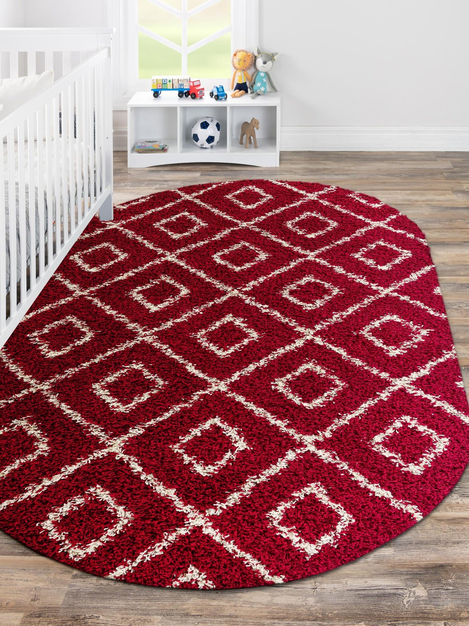 Burgundy Red 7' 10 x 10' Trellis Shag Oval Area Rug Thick Soft Touch Fluffy & Plush Shaggy Pile