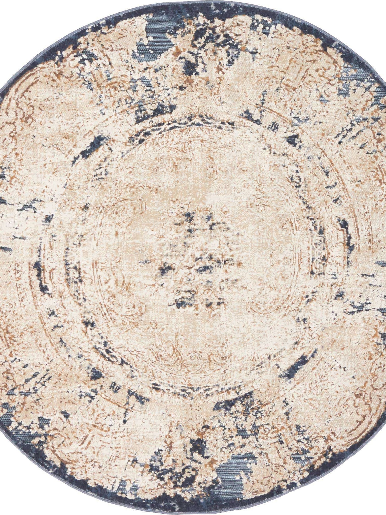 Cream 4' 1 x 4' 1 Chateau Round Area Rug 85% Polypropylene & 15% Chenille With Cotton Backing Traditional Vintage Distressed Carpet for Classical Interior Design Decorating