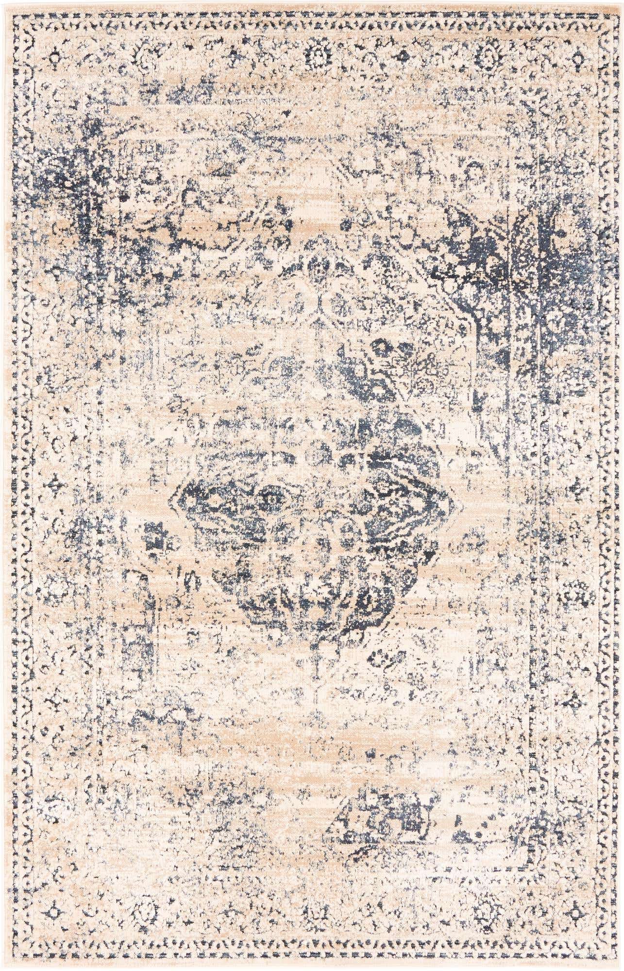 Dark Blue 4' 1 x 6' 1 Chateau Rectangle Area Rug 85% Polypropylene & 15% Chenille With Cotton Backing Traditional Vintage Distressed Carpet for Classical Interior Design Decorating