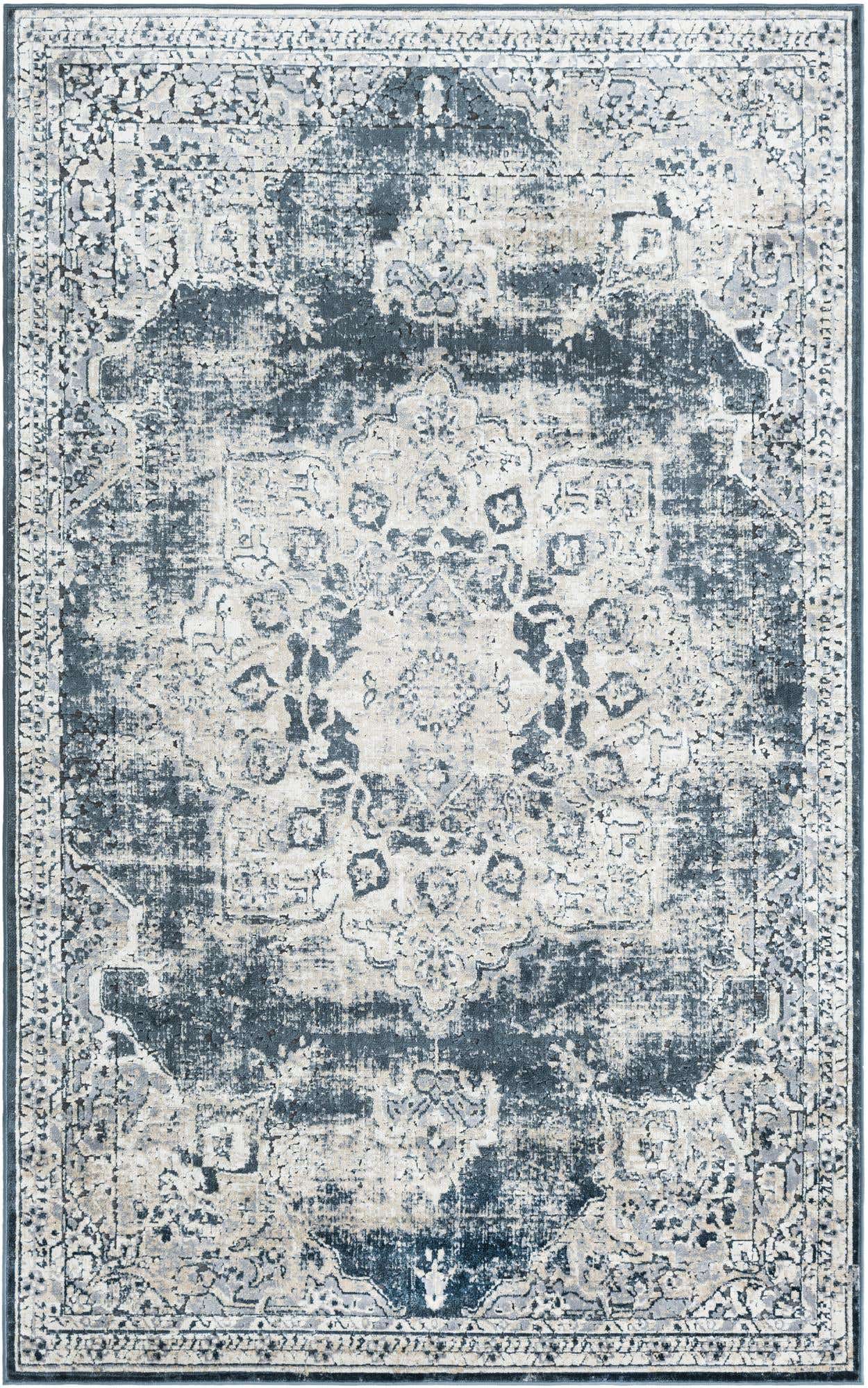 Dark Blue 5' 3 x 8' Chateau Rectangle Area Rug 85% Polypropylene & 15% Chenille With Cotton Backing Traditional Vintage Distressed Carpet for Classical Interior Design Decorating