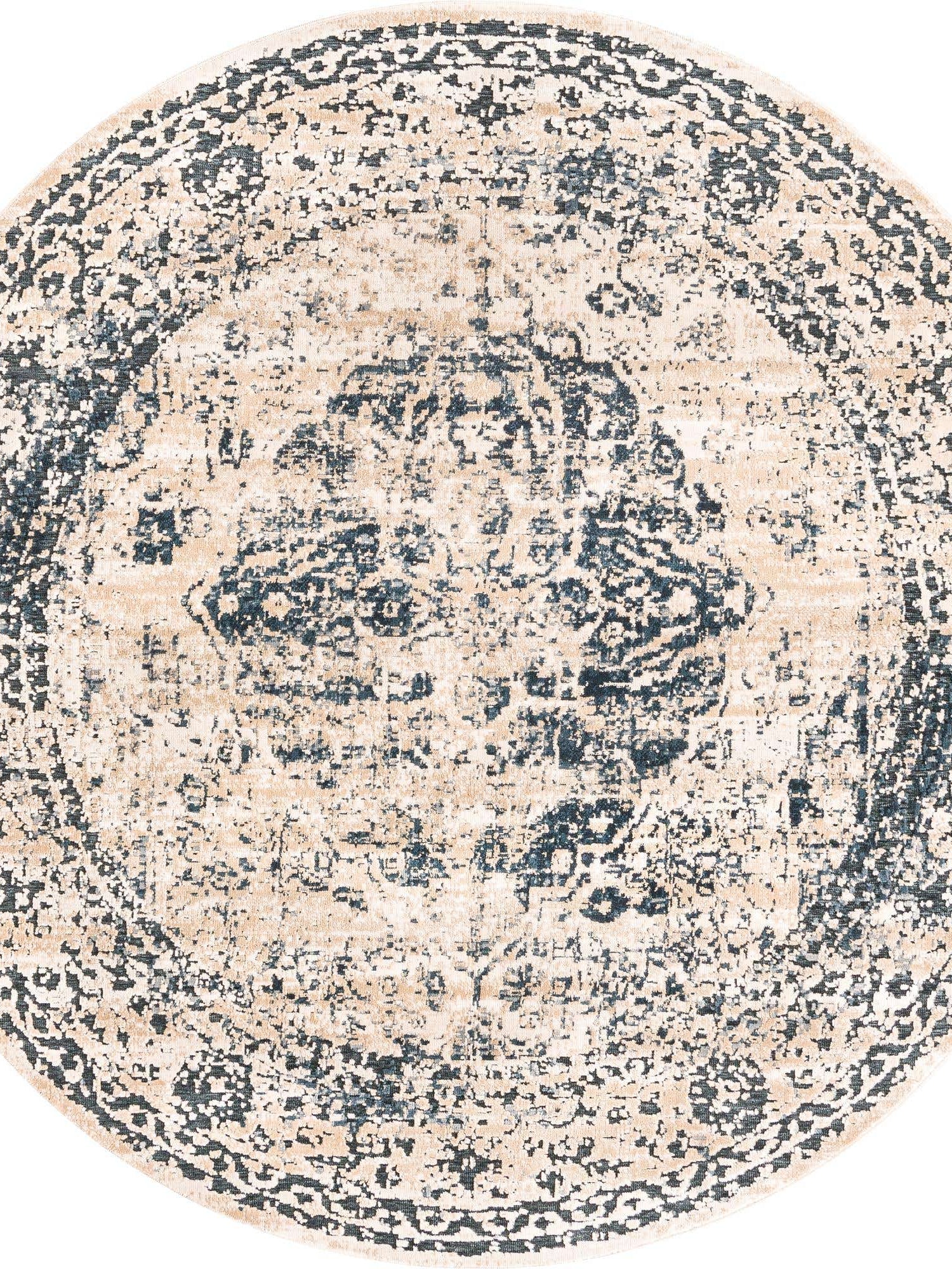 Dark Blue 5' 3 x 5' 3 Chateau Round Area Rug 85% Polypropylene & 15% Chenille With Cotton Backing Traditional Vintage Distressed Carpet for Classical Interior Design Decorating