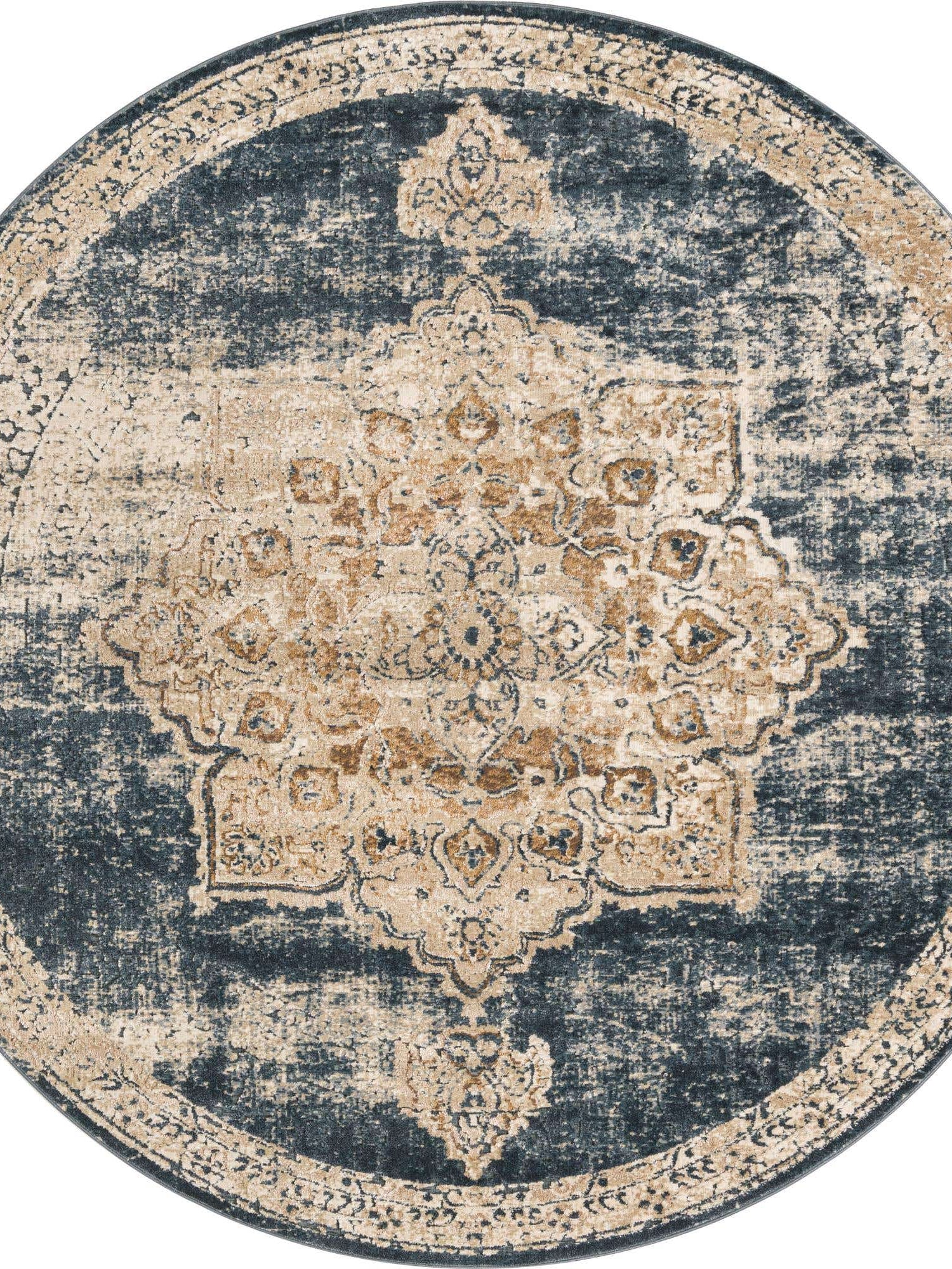 Dark Blue 6' 1 x 6' 1 Chateau Round Area Rug 85% Polypropylene & 15% Chenille With Cotton Backing Traditional Vintage Distressed Carpet for Classical Interior Design Decorating