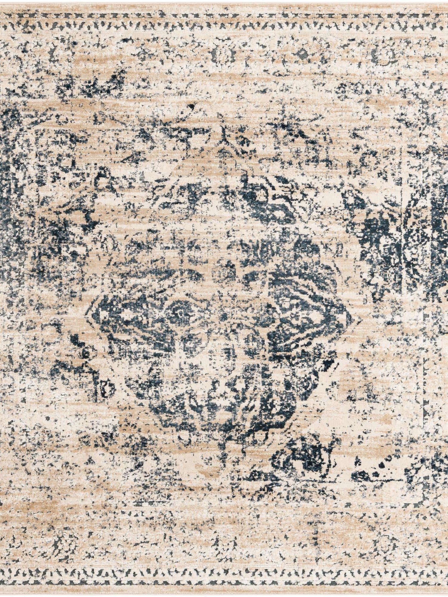Dark Blue 6' 1 x 6' 1 Chateau Square Area Rug 85% Polypropylene & 15% Chenille With Cotton Backing Traditional Vintage Distressed Carpet for Classical Interior Design Decorating