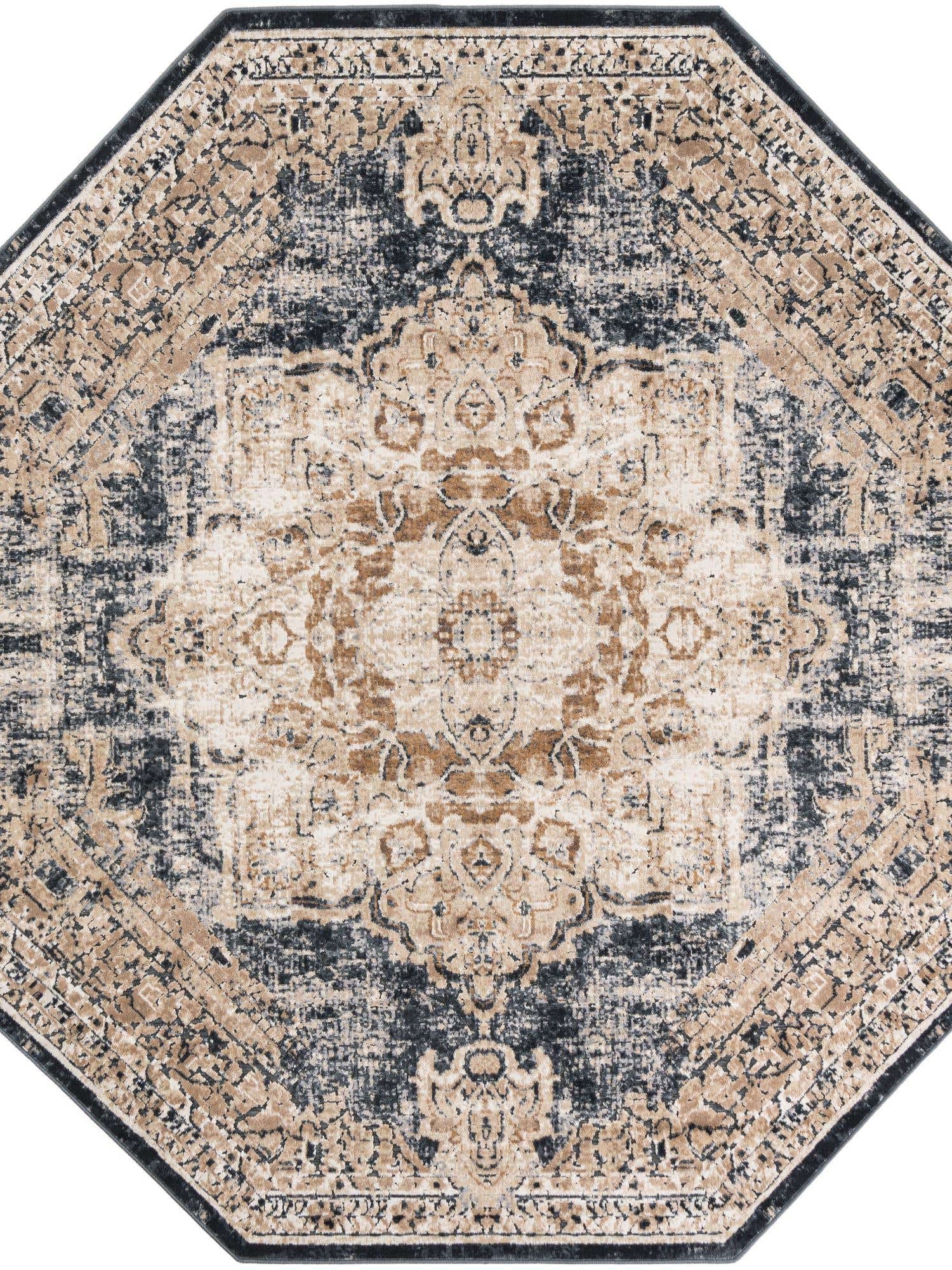 Dark Blue 7' 1 x 7' 1 Chateau Octagon Area Rug 85% Polypropylene & 15% Chenille With Cotton Backing Traditional Vintage Distressed Carpet for Classical Interior Design Decorating