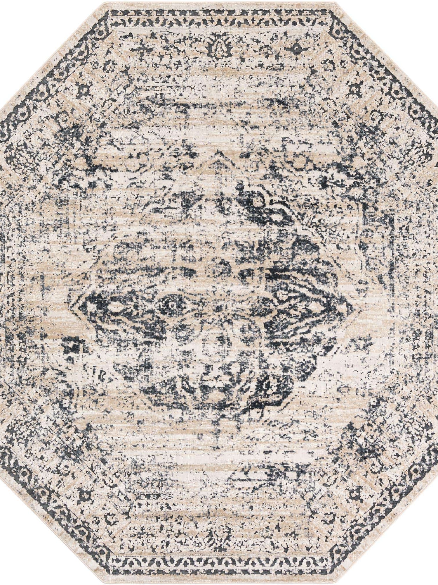 Dark Blue 7' 1 x 7' 1 Chateau Octagon Area Rug 85% Polypropylene & 15% Chenille With Cotton Backing Traditional Vintage Distressed Carpet for Classical Interior Design Decorating