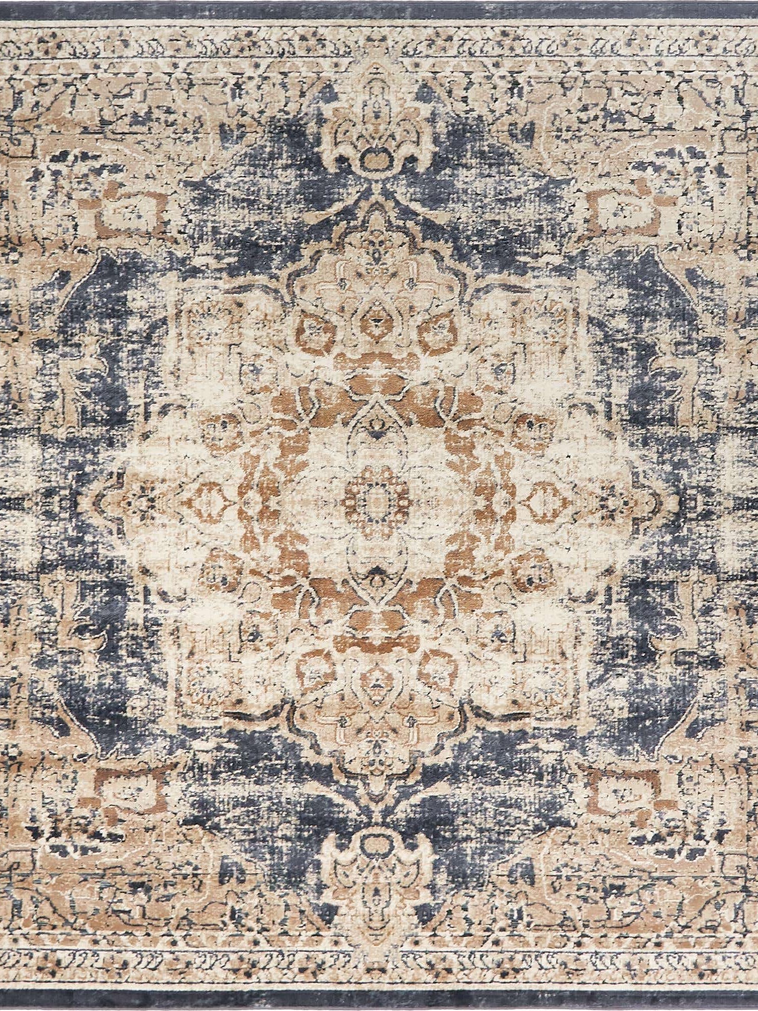Dark Blue 7' 1 x 7' 1 Chateau Square Area Rug 85% Polypropylene & 15% Chenille With Cotton Backing Traditional Vintage Distressed Carpet for Classical Interior Design Decorating