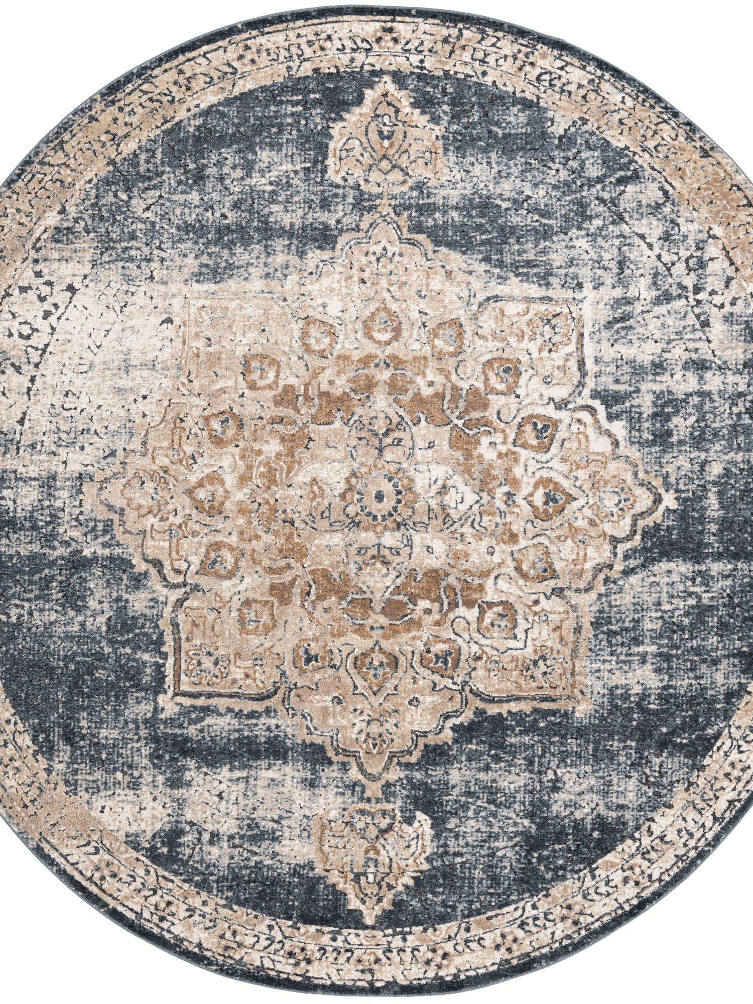 Dark Blue 7' 1 x 7' 1 Chateau Round Area Rug 85% Polypropylene & 15% Chenille With Cotton Backing Traditional Vintage Distressed Carpet for Classical Interior Design Decorating