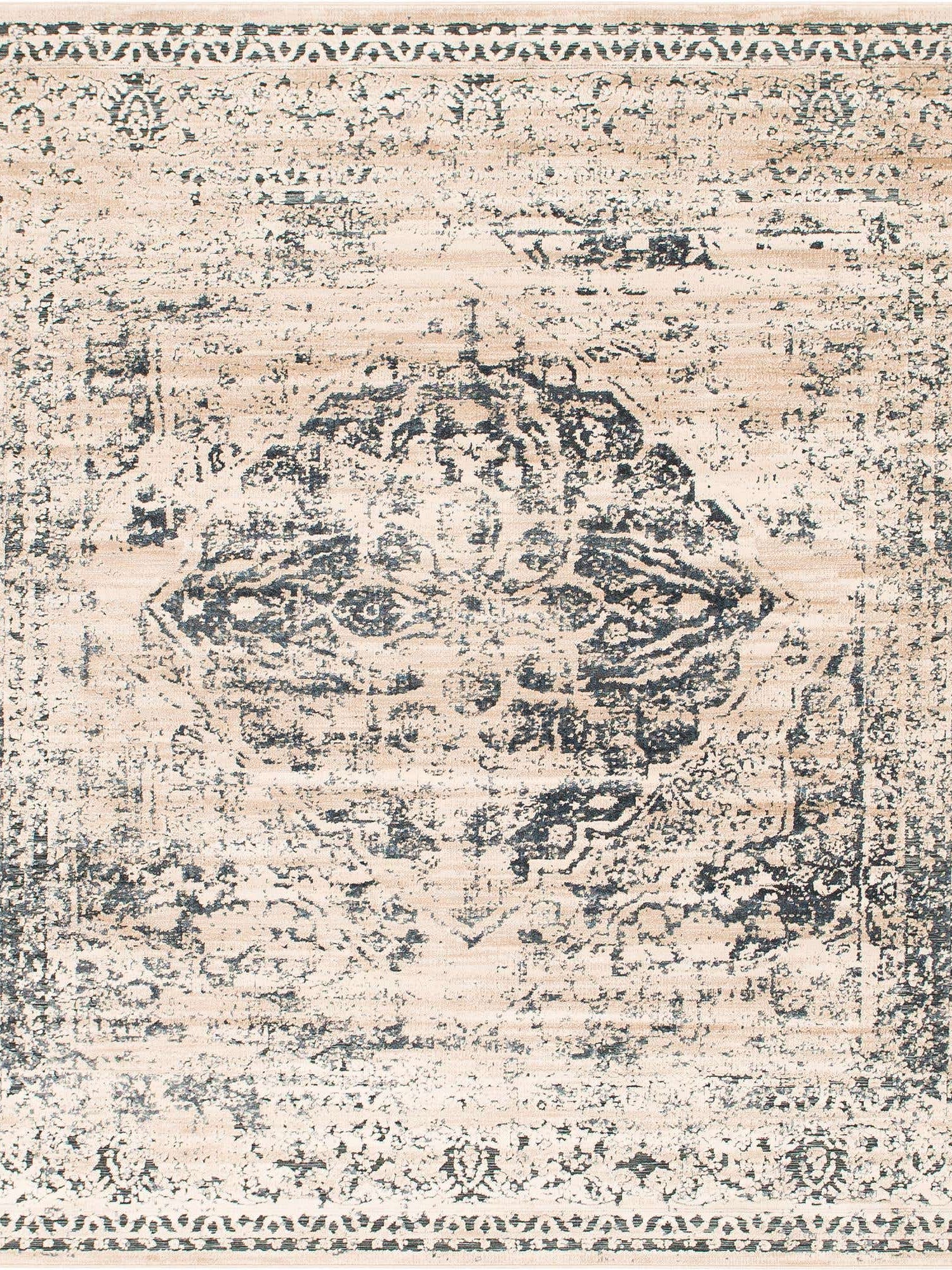 Dark Blue 6' 9 x 7' 1 Chateau Square Area Rug 85% Polypropylene & 15% Chenille With Cotton Backing Traditional Vintage Distressed Carpet for Classical Interior Design Decorating