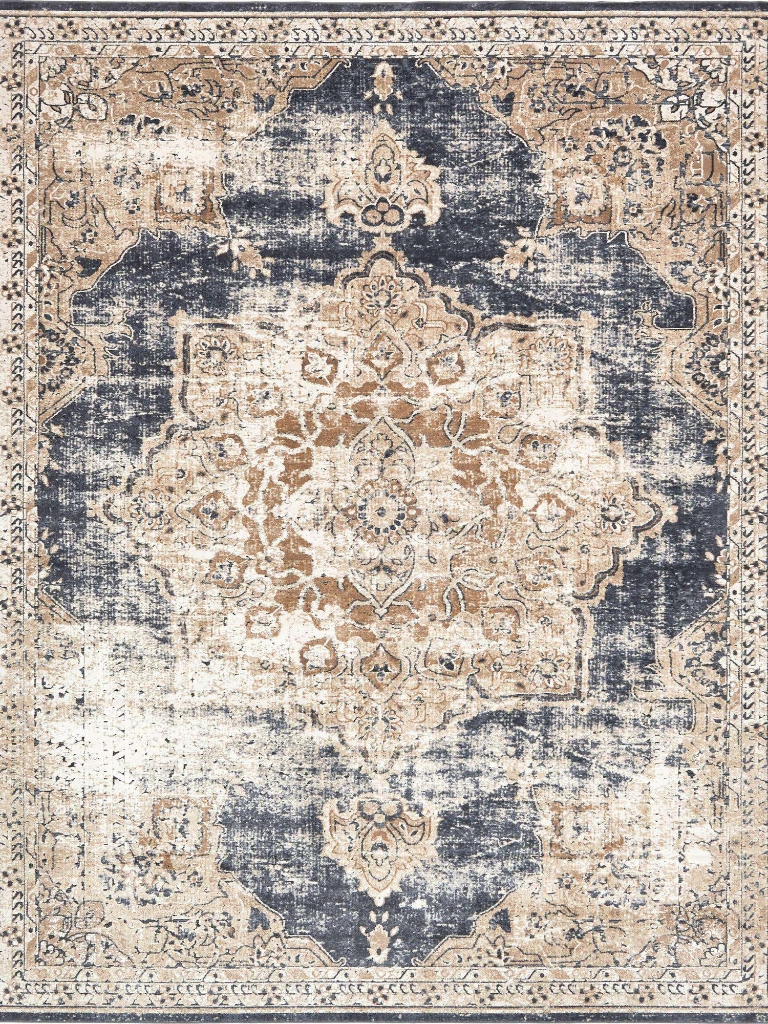 Dark Blue 7' 10 x 10' Chateau Rectangle Area Rug 85% Polypropylene & 15% Chenille With Cotton Backing Traditional Vintage Distressed Carpet for Classical Interior Design Decorating