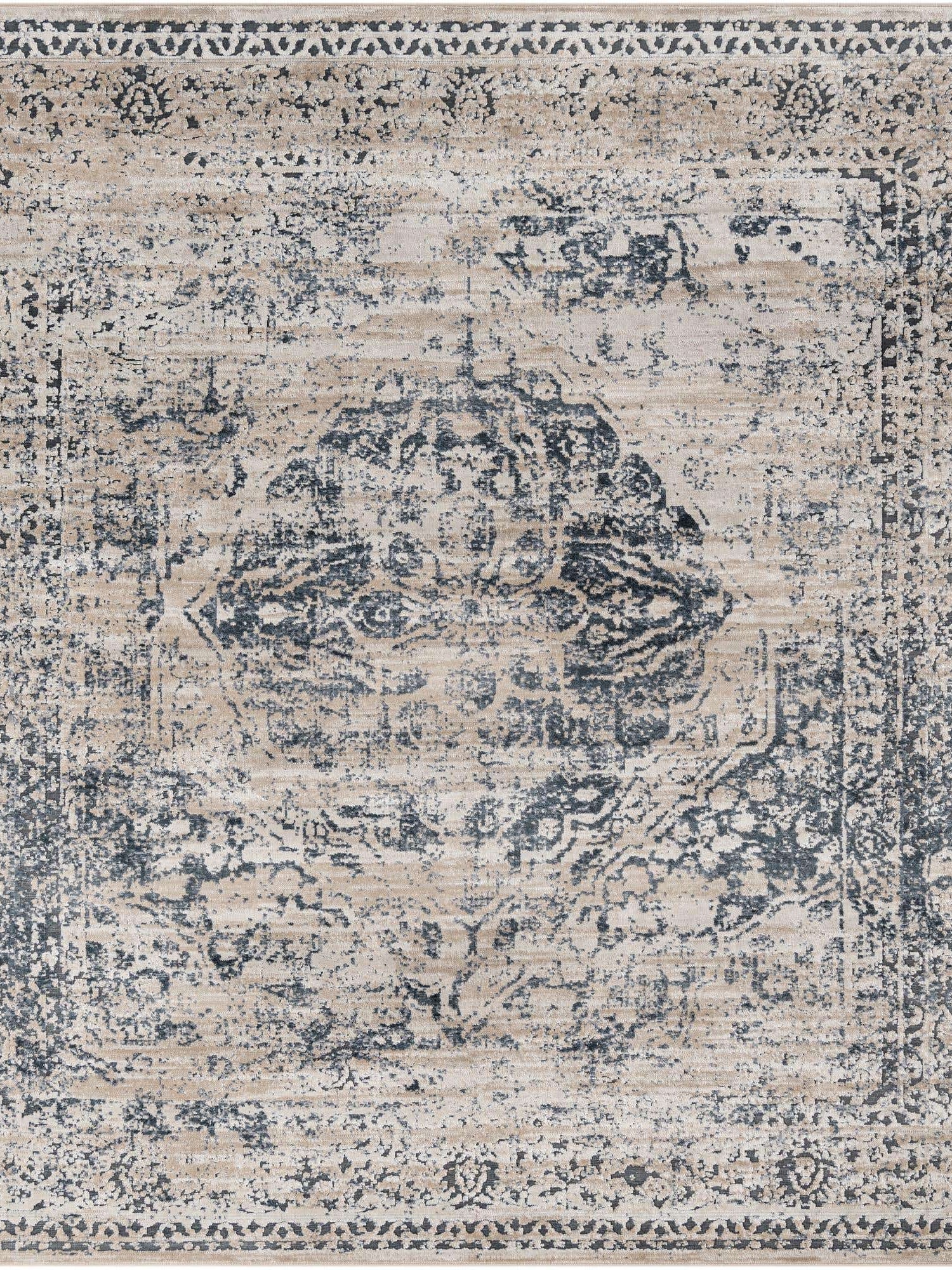 Dark Blue 7' 10 x 7' 10 Chateau Square Area Rug 85% Polypropylene & 15% Chenille With Cotton Backing Traditional Vintage Distressed Carpet for Classical Interior Design Decorating