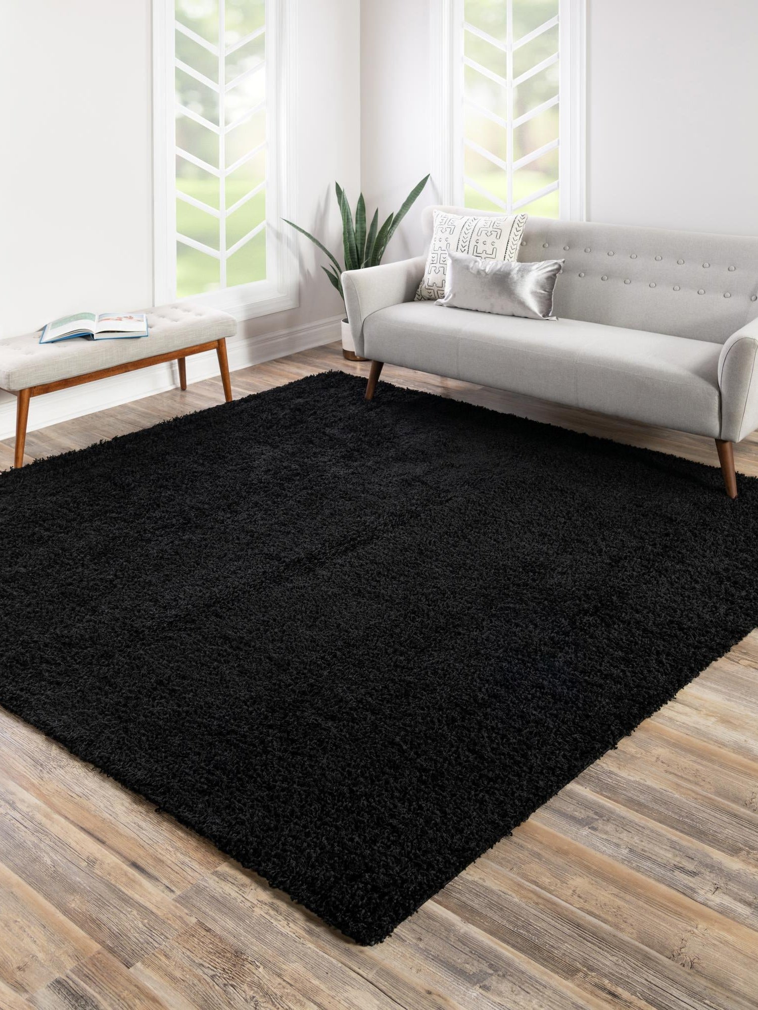 Jet Black 7' 10 x 7' 10 Solid Shag Square Area Rug Thick Soft Touch Fluffy & Plush Shaggy Pile
