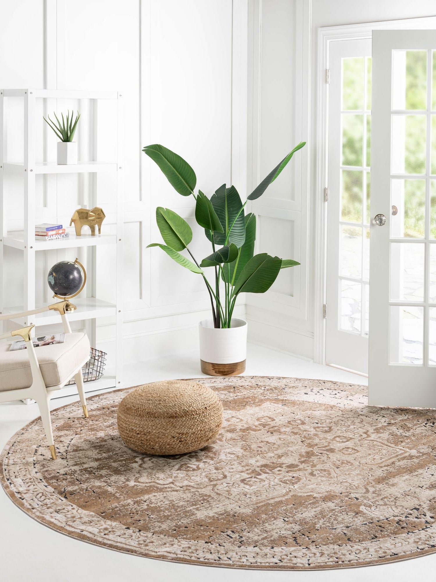 Khaki 4' 1 x 4' 1 Chateau Round Area Rug 85% Polypropylene & 15% Chenille With Cotton Backing Traditional Vintage Distressed Carpet for Classical Interior Design Decorating