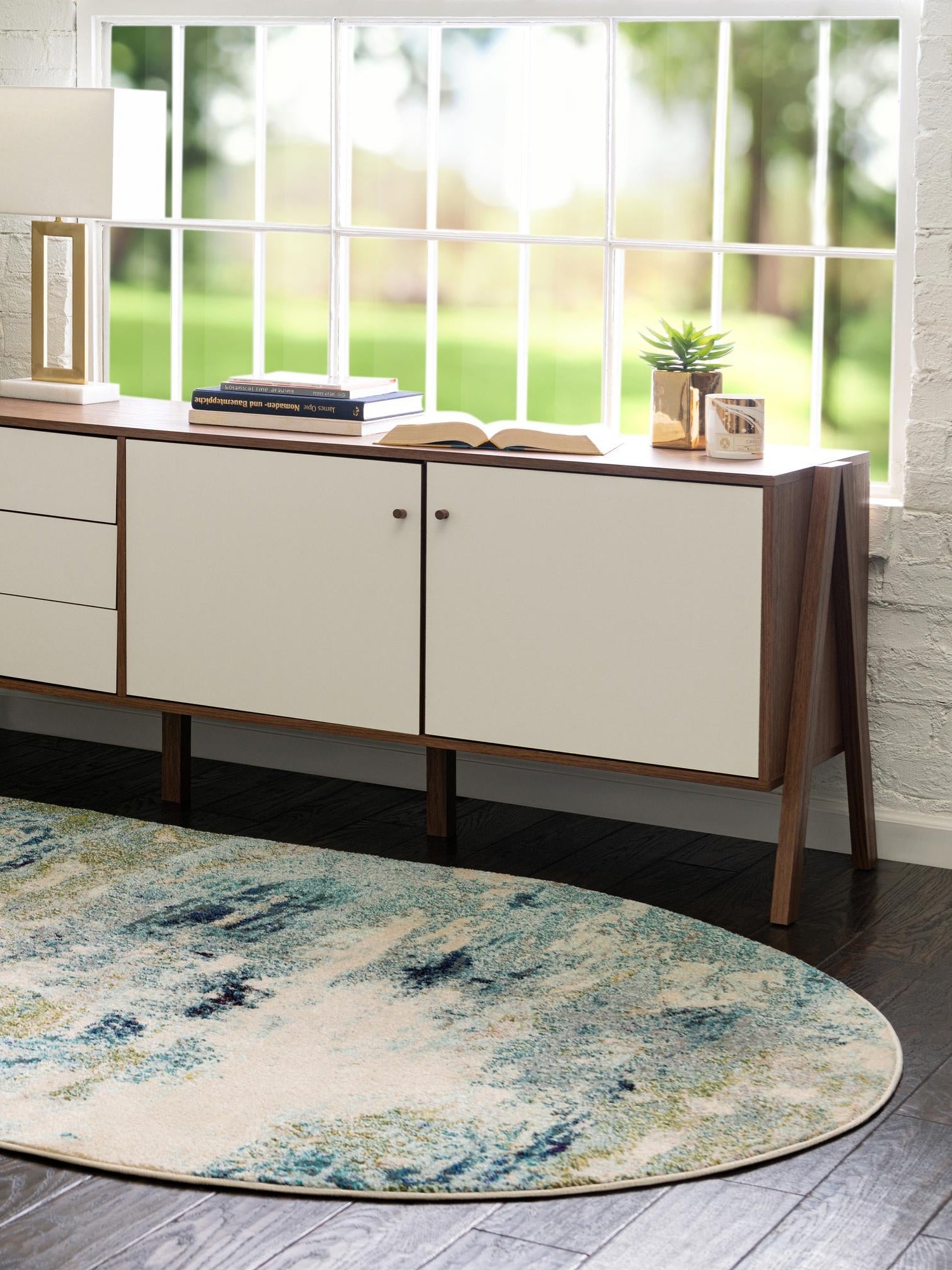 - Elegant Design: The light blue color adds a touch of serenity and style to your decor. This modern piece from the Chromatic collection not only elevates the aesthetic of your space but also creates a calming atmosphere. Its oval shape stands out, providing visual interest compared to traditional rectangular rugs.