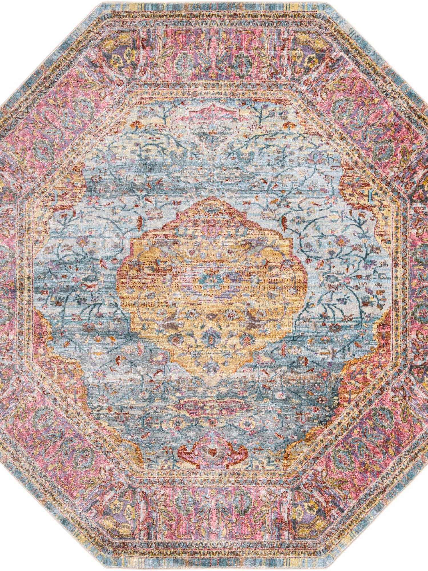 Light Blue 8' x 8' Baracoa Octagon Area Rug 100% Polypropylene Distressed Vintage Living Dining Room Office Traditional Carpet