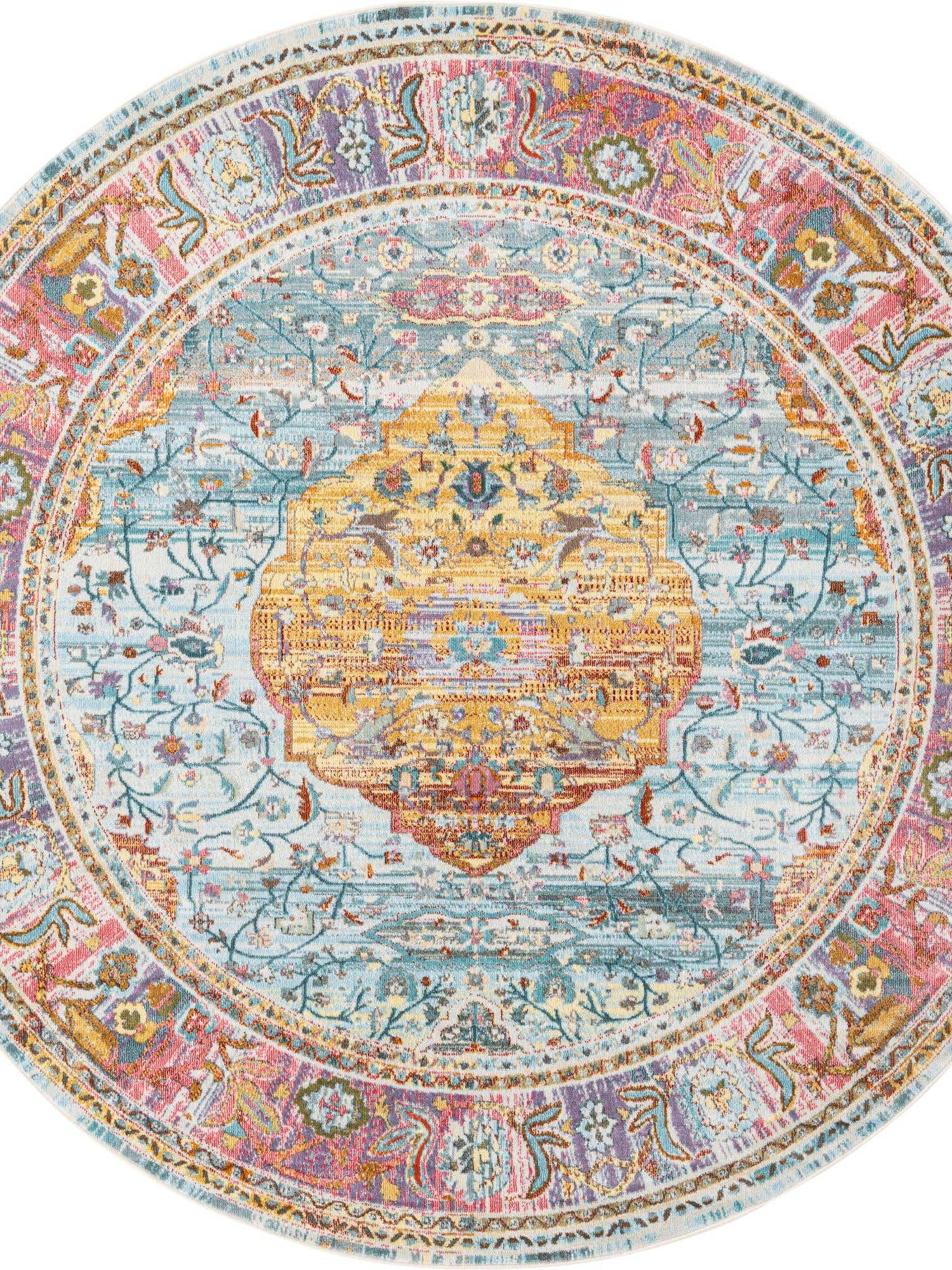 Light Blue 8' x 8' Baracoa Round Area Rug 100% Polypropylene Distressed Vintage Living Dining Room Office Traditional Carpet