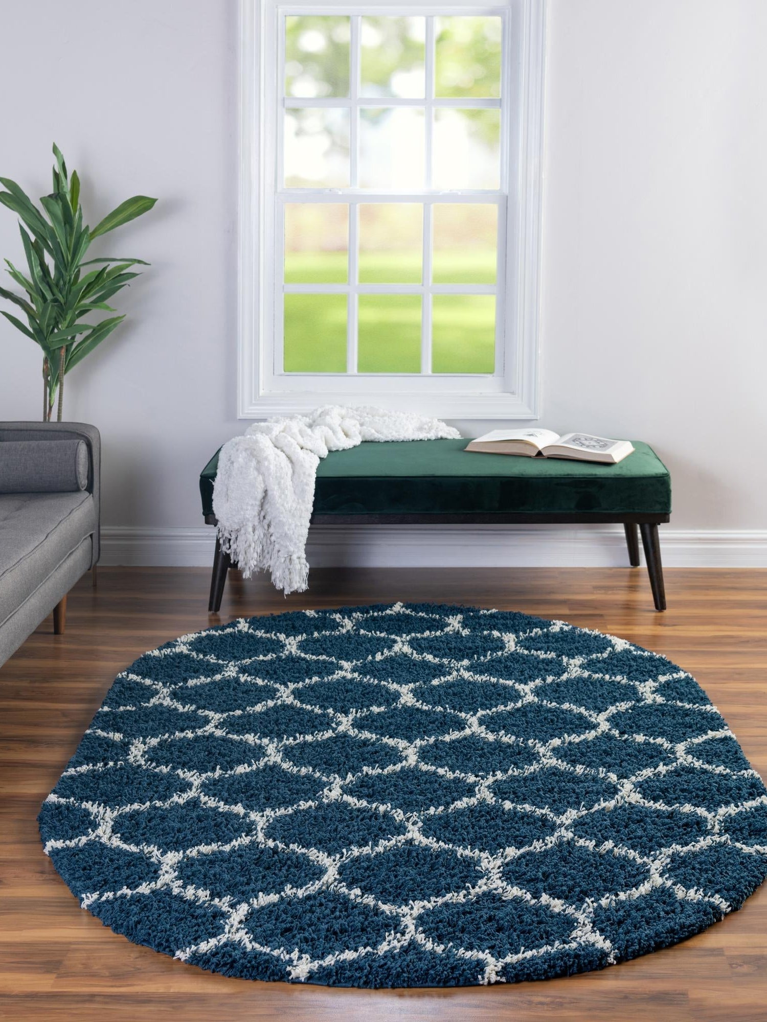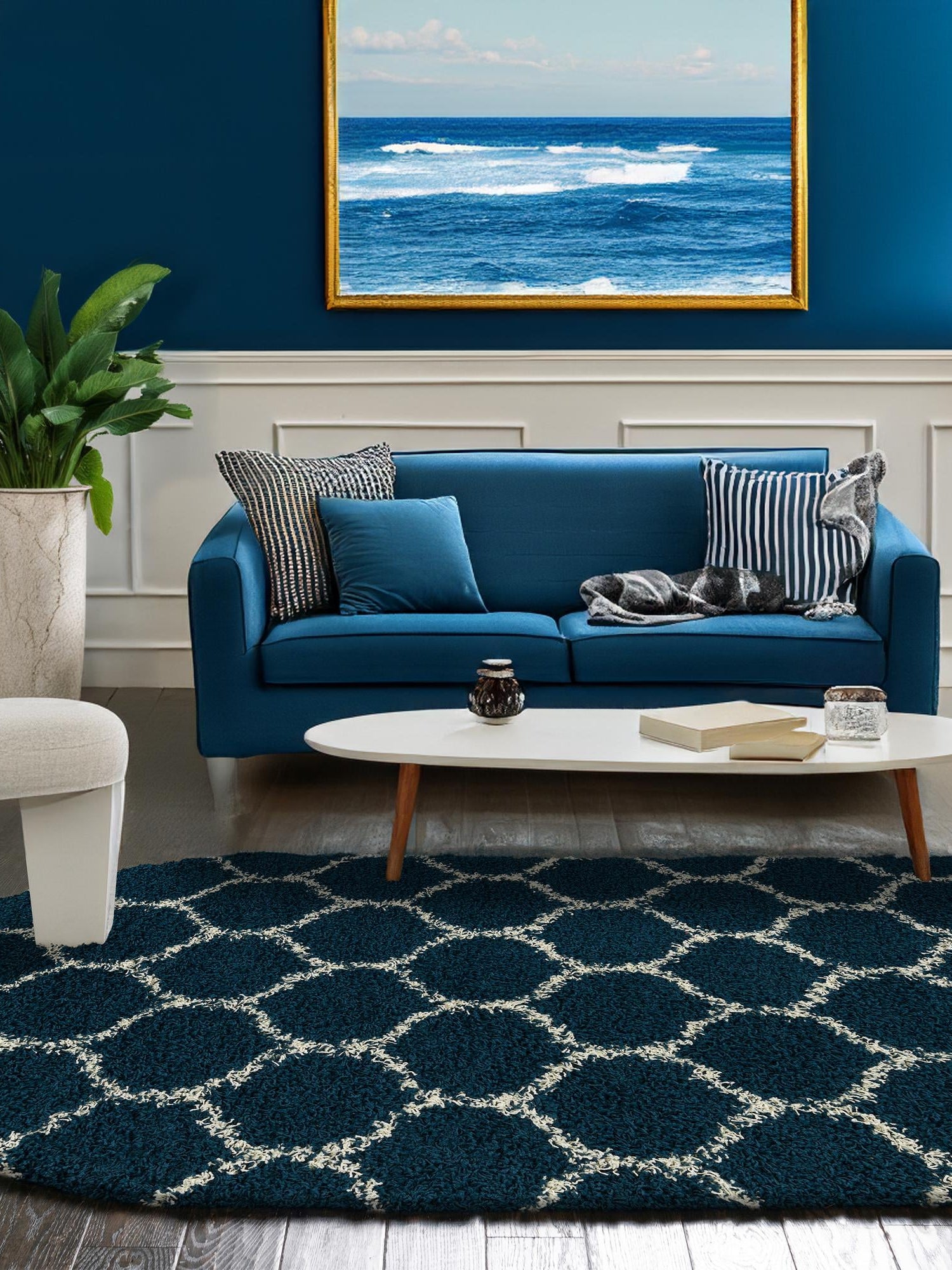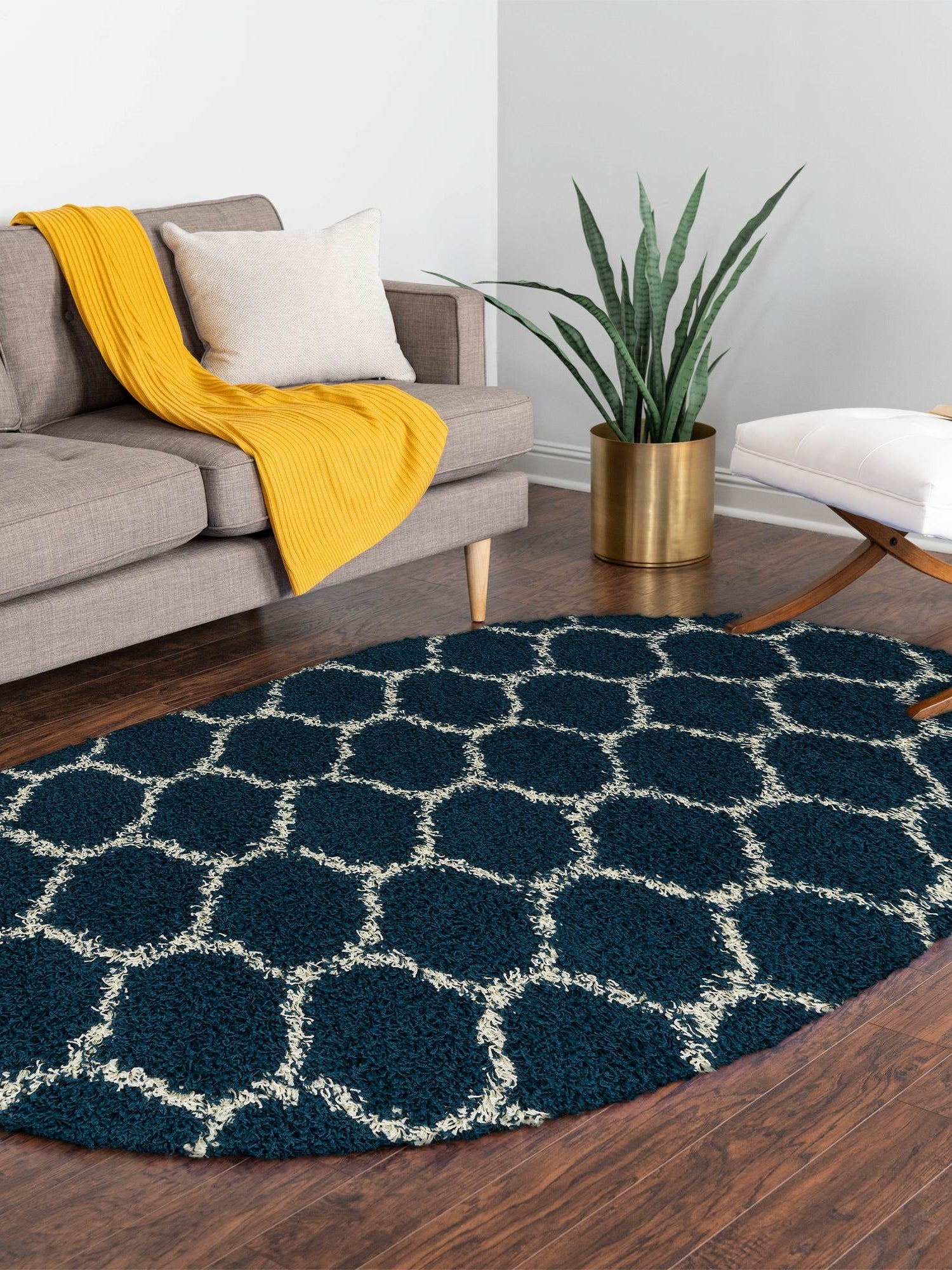Navy Blue 5' 3 x 8' Trellis Shag Oval Area Rug Thick Soft Touch Fluffy & Plush Shaggy Pile