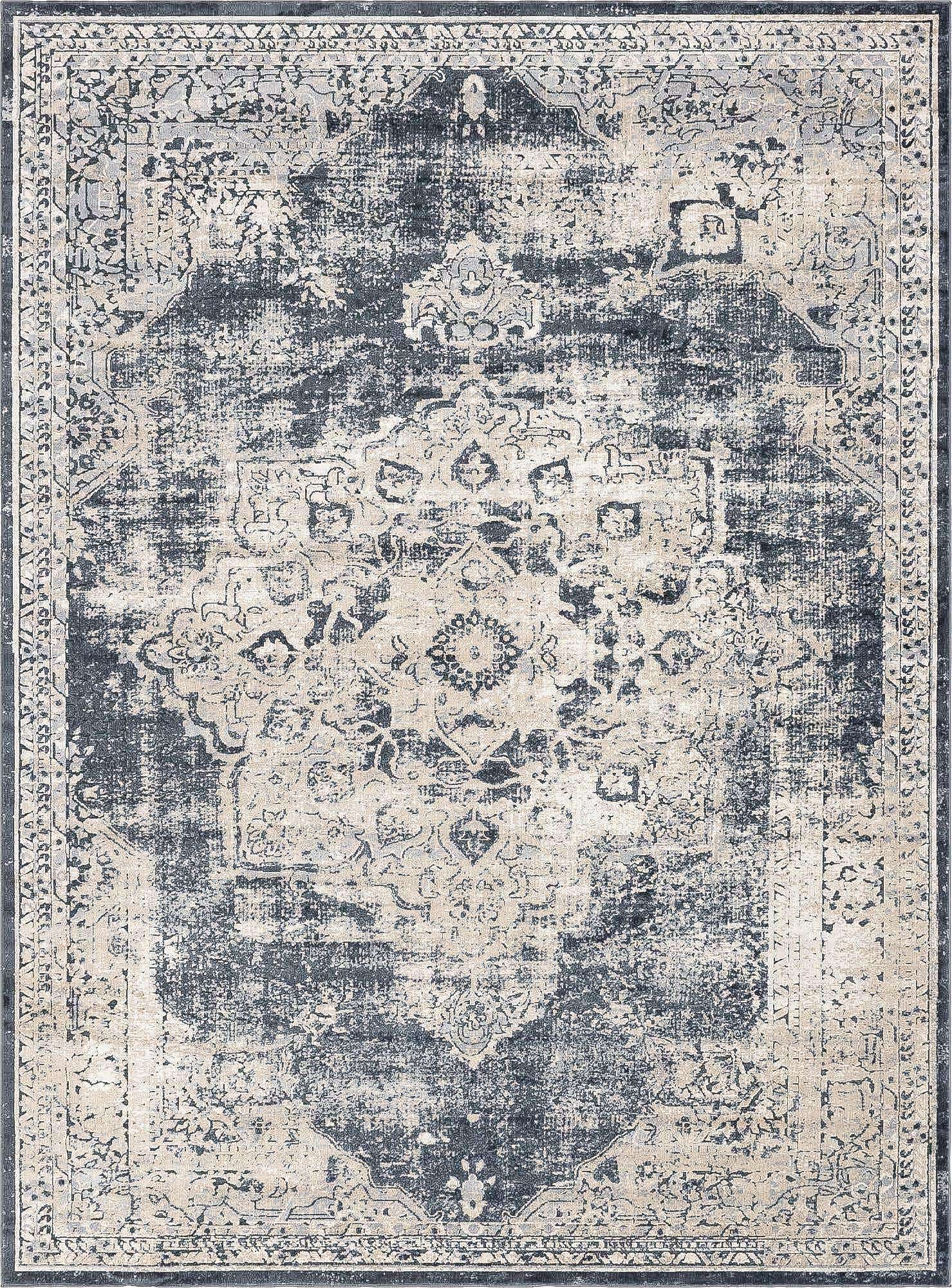 Navy Blue 9' x 12' Chateau Rectangle Area Rug 85% Polypropylene & 15% Chenille With Cotton Backing Traditional Vintage Distressed Carpet for Classical Interior Design Decorating