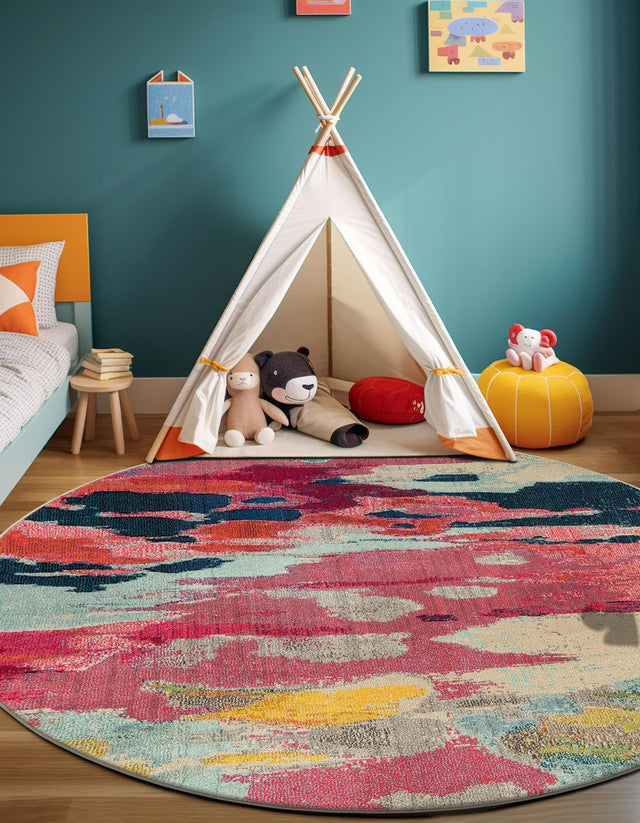 Pink 5' 3 x 5' 3 Estrella Round Area Rug 100% Polypropylene Non-Shedding Stain Resistant Carpet Colorful Modern Abstract Design Easy Clean for Home Decor