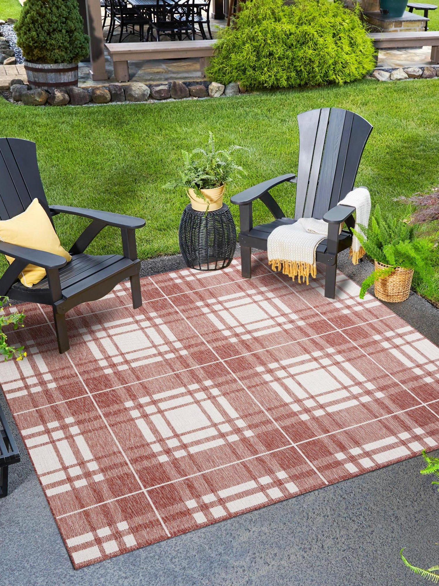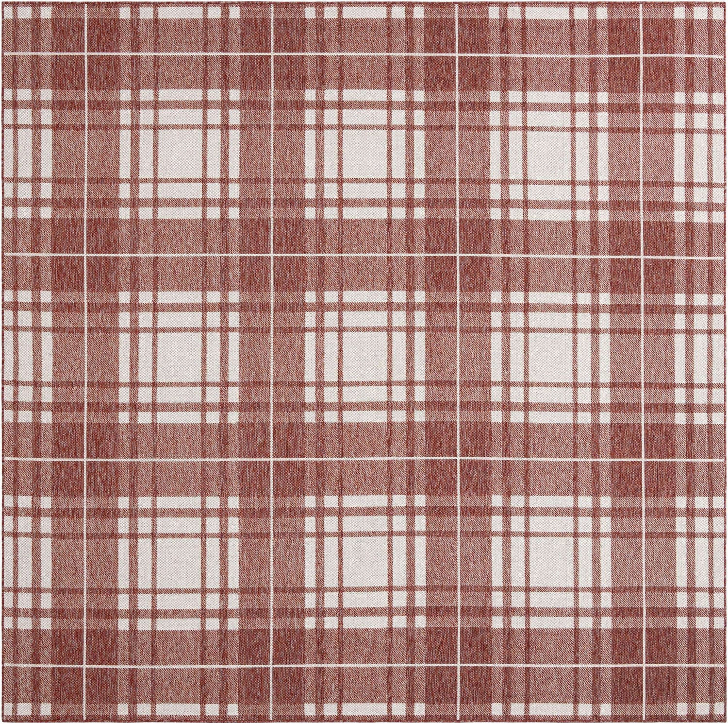 Red 10' x 10' Outdoor Checkered Square Area Rug Weather Resistant for Patio, Deck, Terrace, Balcony, Porch
