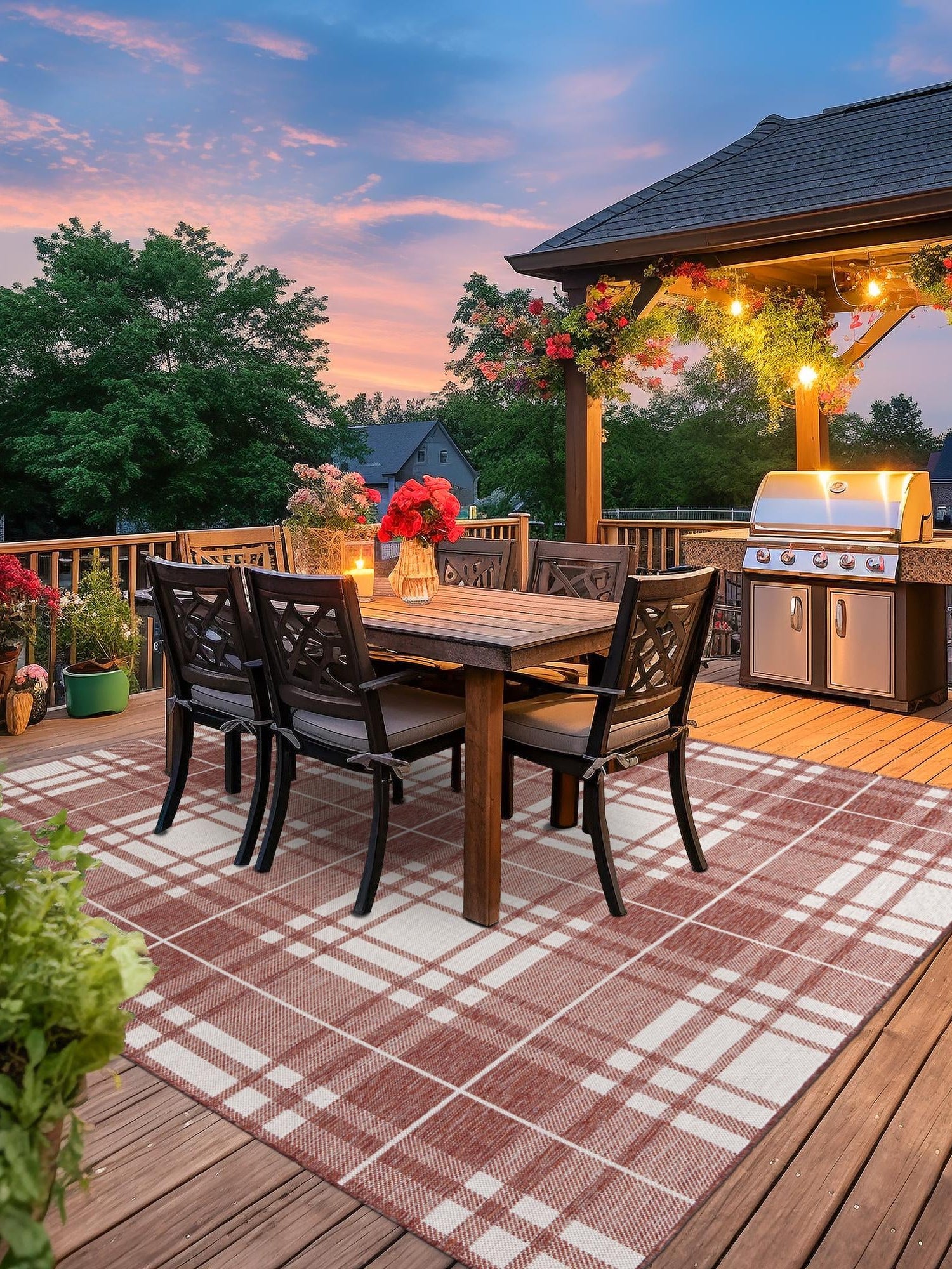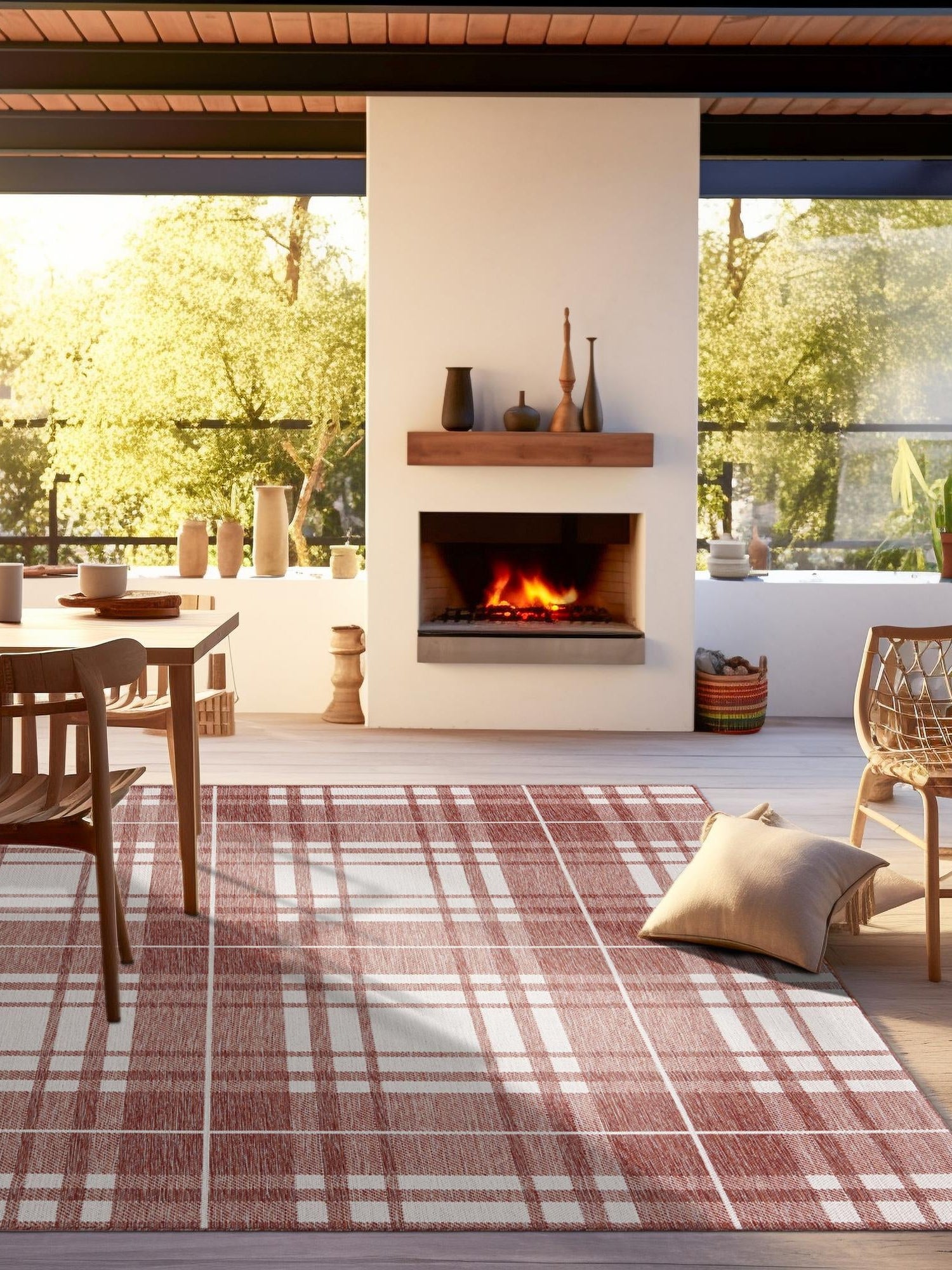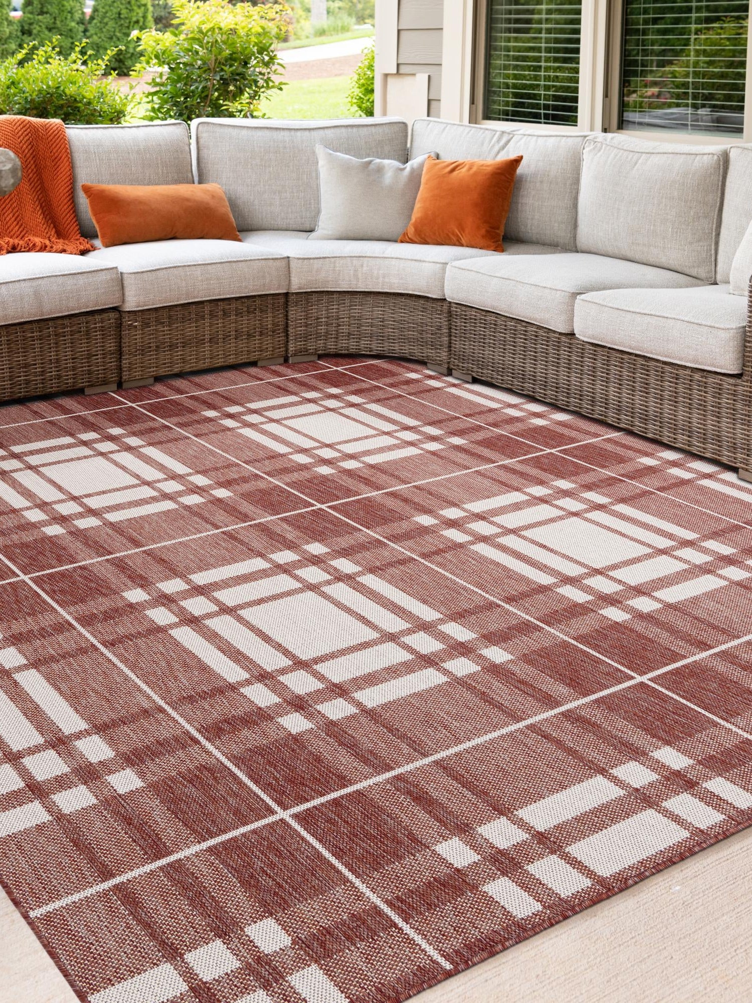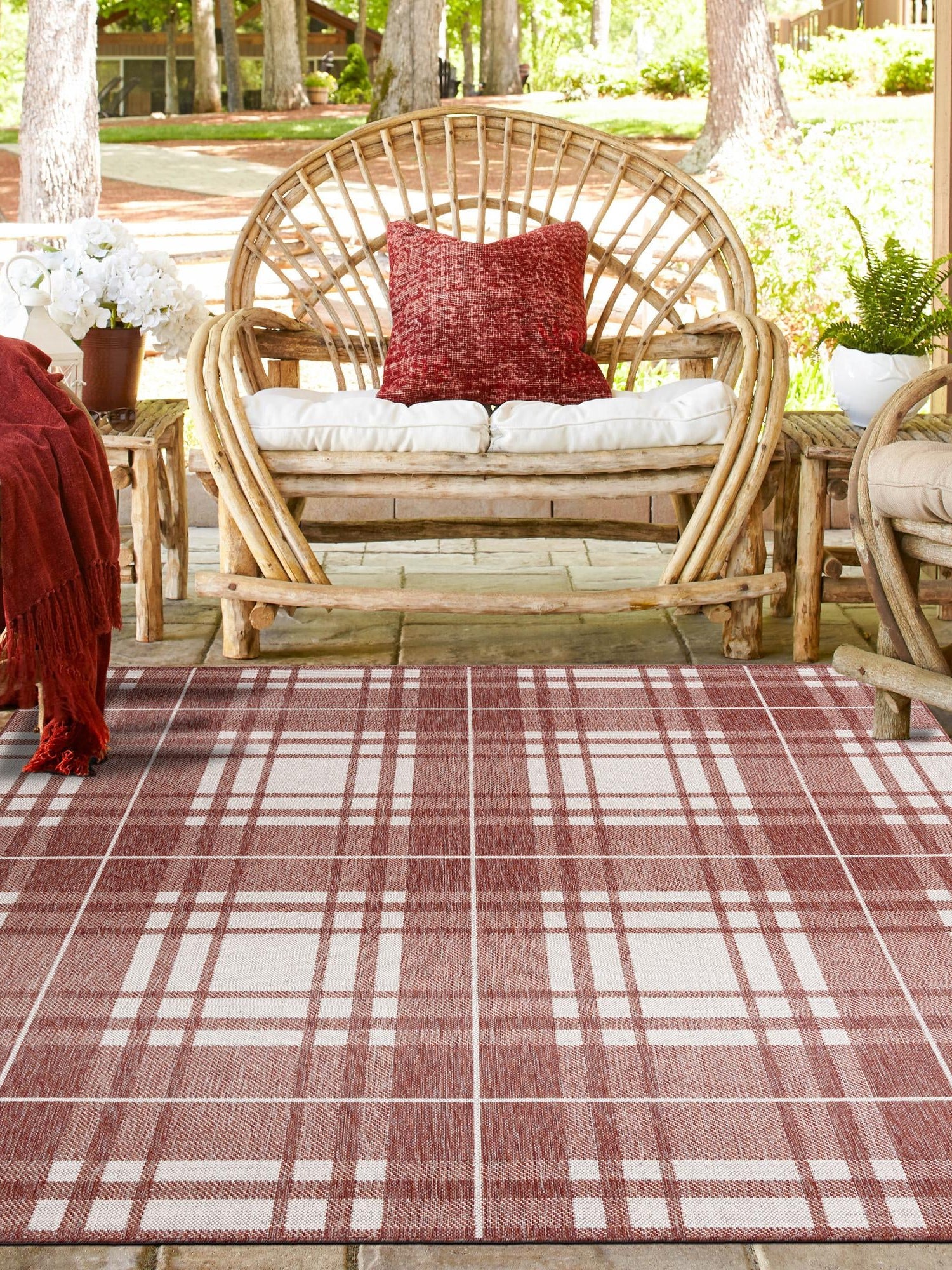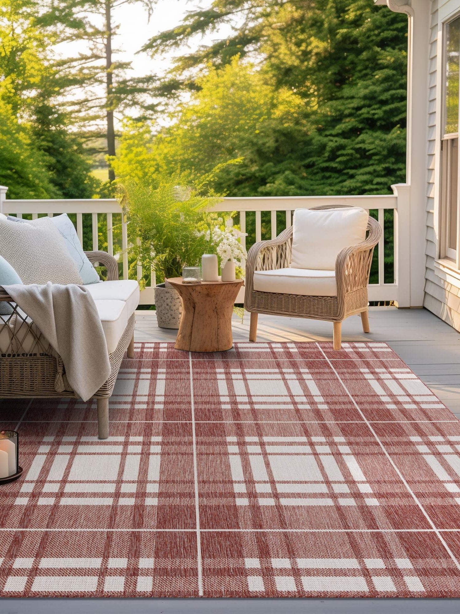 - Eye-Catching Design: Featuring a vibrant red color and a contemporary checkered pattern, this rug adds a stylish flair to any outdoor setting. The geometric design complements modern designs and brings a pop of color that can liven up dull spaces. It's perfect for those looking to express their unique style through outdoor décor.