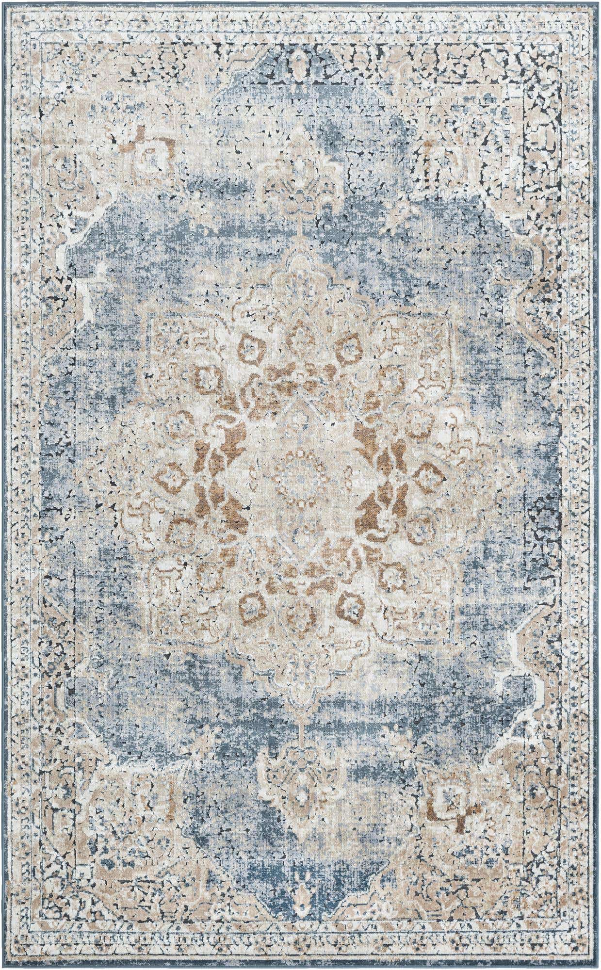 Slate Blue 5' 3 x 8' Chateau Rectangle Area Rug 85% Polypropylene & 15% Chenille With Cotton Backing Traditional Vintage Distressed Carpet for Classical Interior Design Decorating