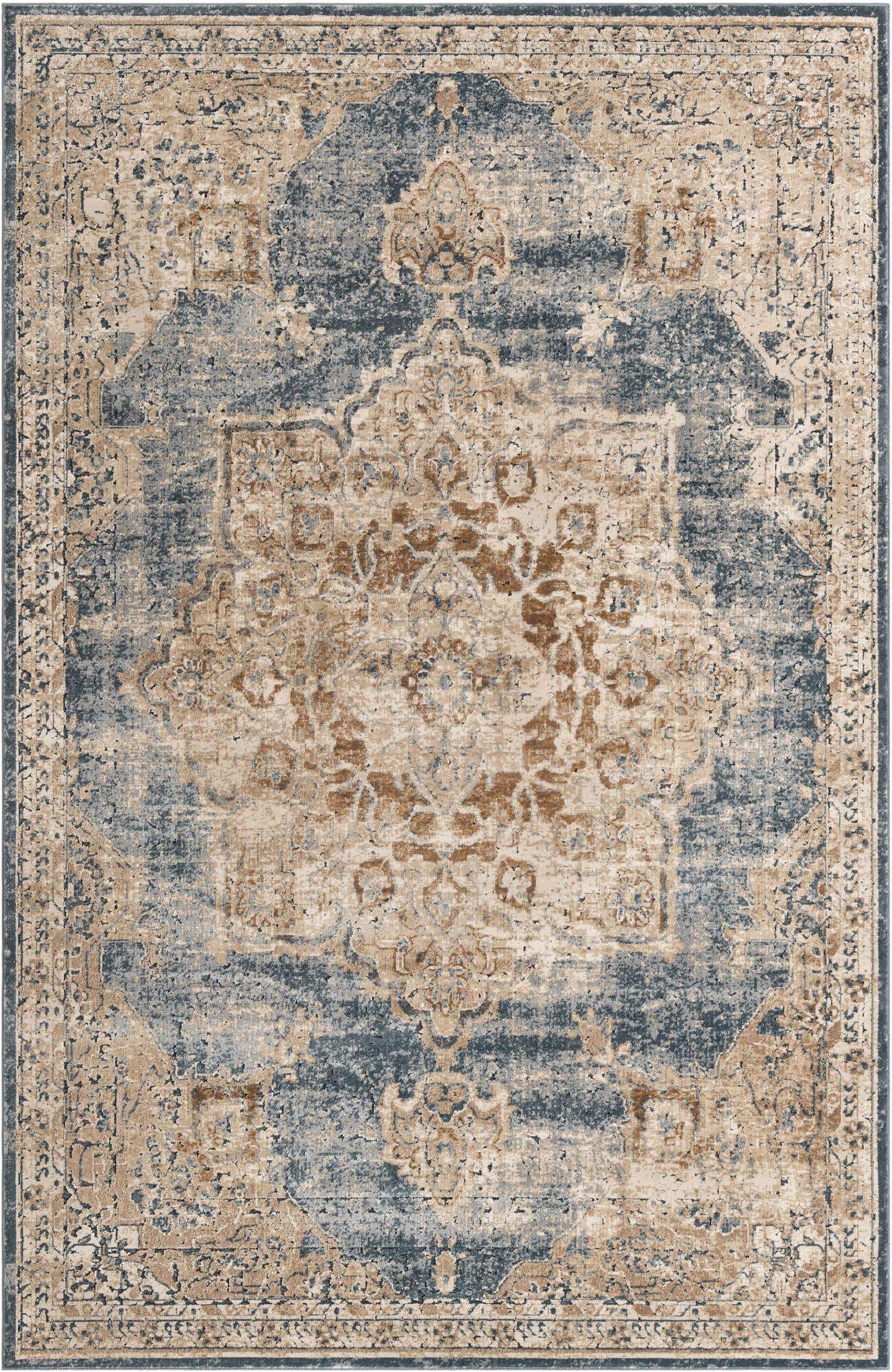 Slate Blue 6' 1 x 9' Chateau Rectangle Area Rug 85% Polypropylene & 15% Chenille With Cotton Backing Traditional Vintage Distressed Carpet for Classical Interior Design Decorating