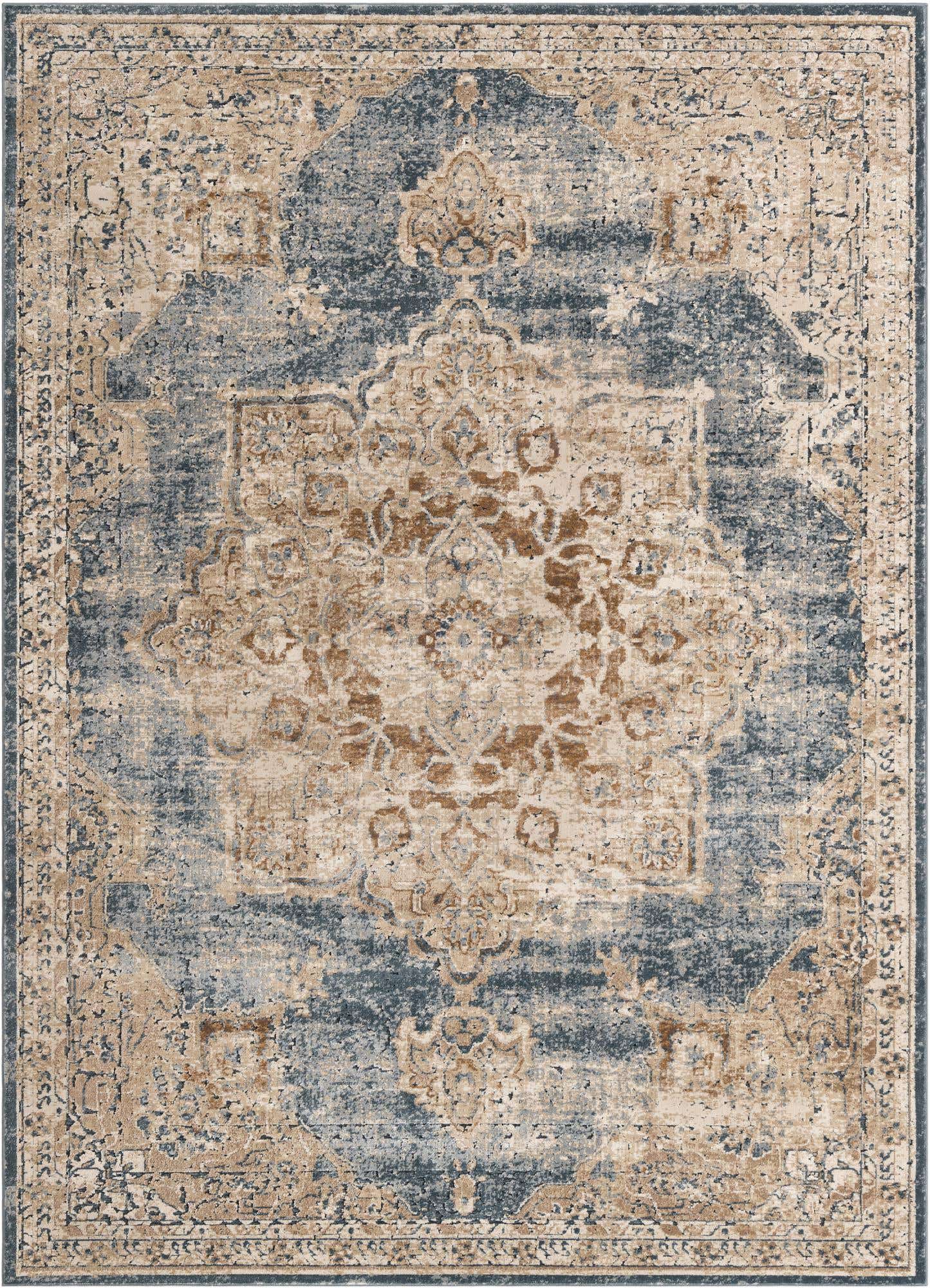 Slate Blue 9' x 12' Chateau Rectangle Area Rug 85% Polypropylene & 15% Chenille With Cotton Backing Traditional Vintage Distressed Carpet for Classical Interior Design Decorating