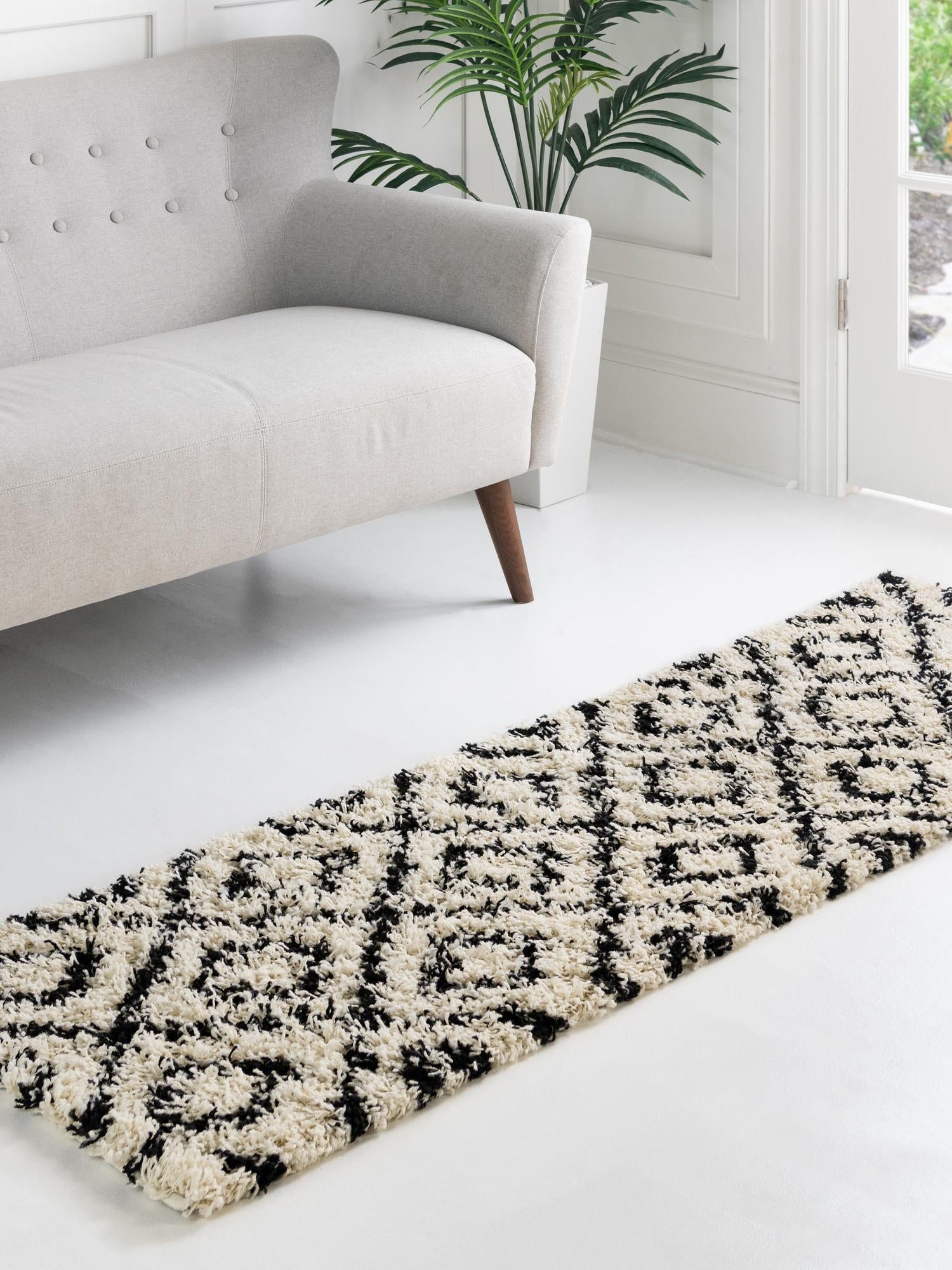 White and Black 2' 7 x 12' Trellis Shag Runner Area Rug Thick Soft Touch Fluffy & Plush Shaggy Pile