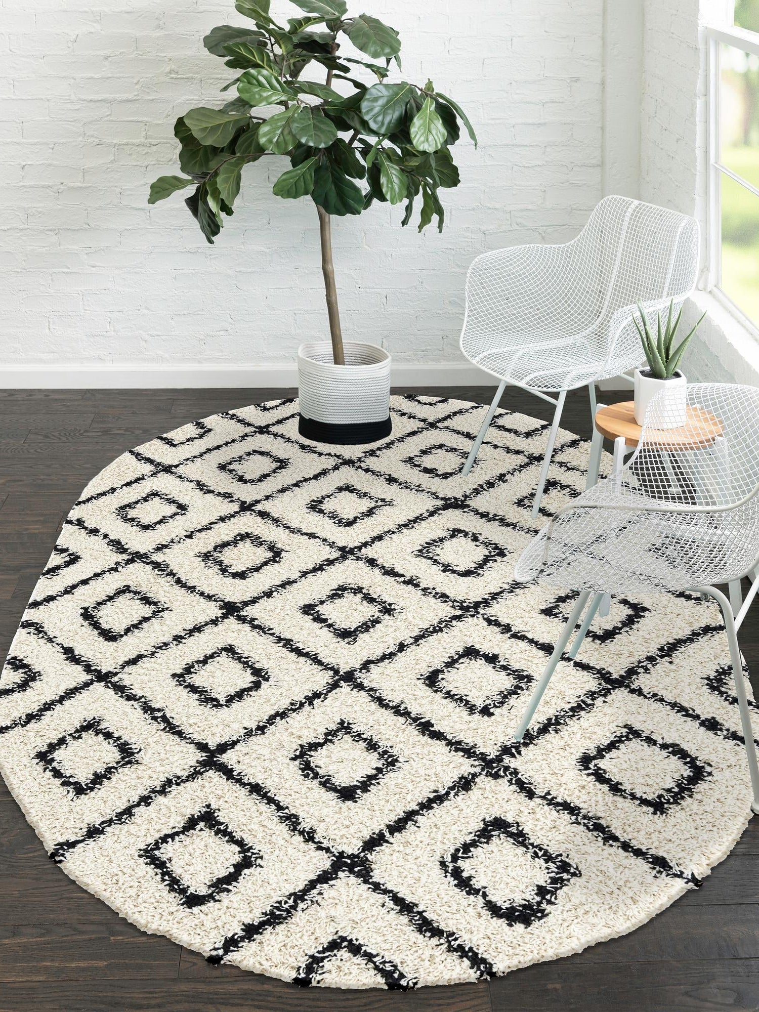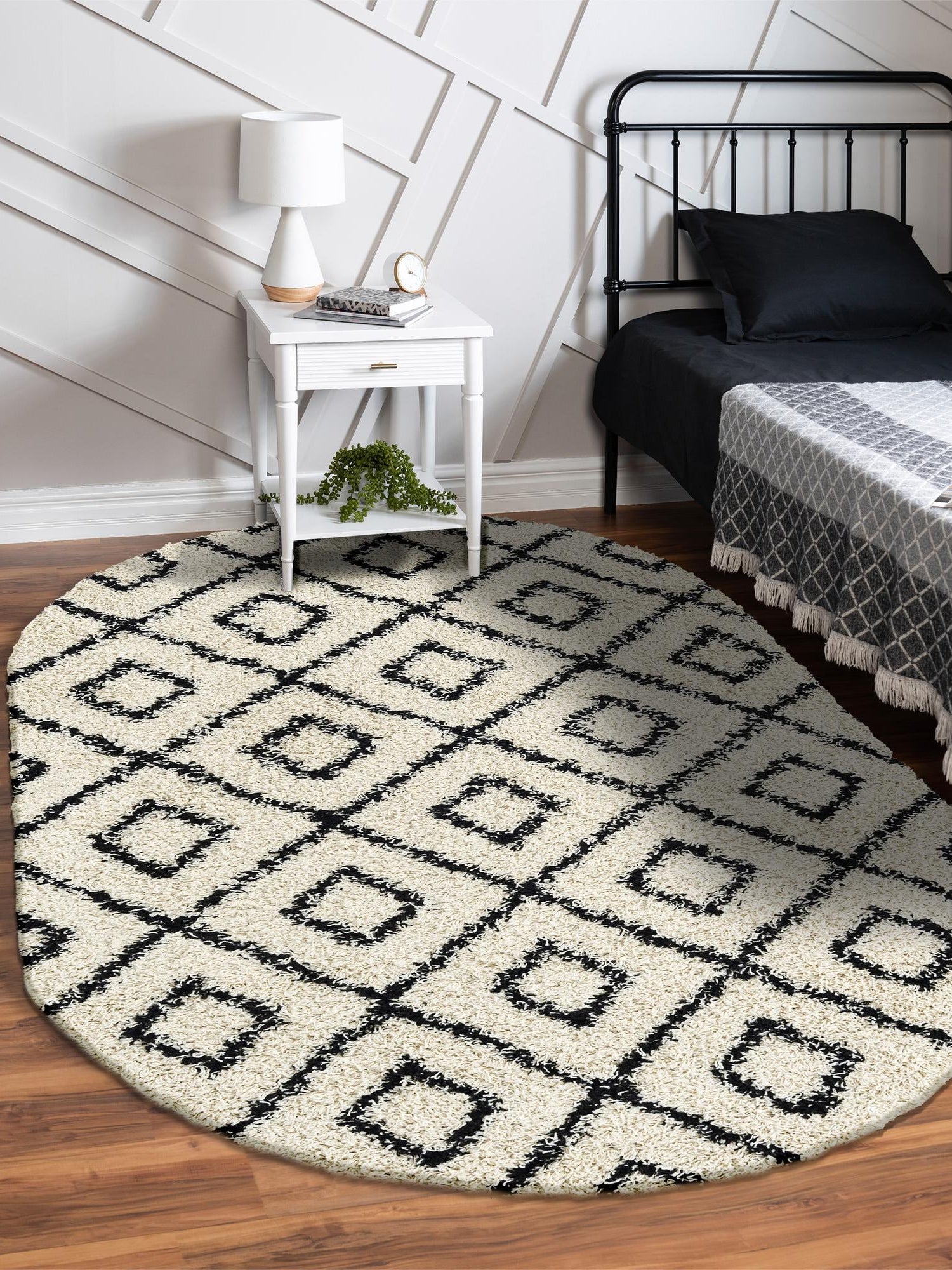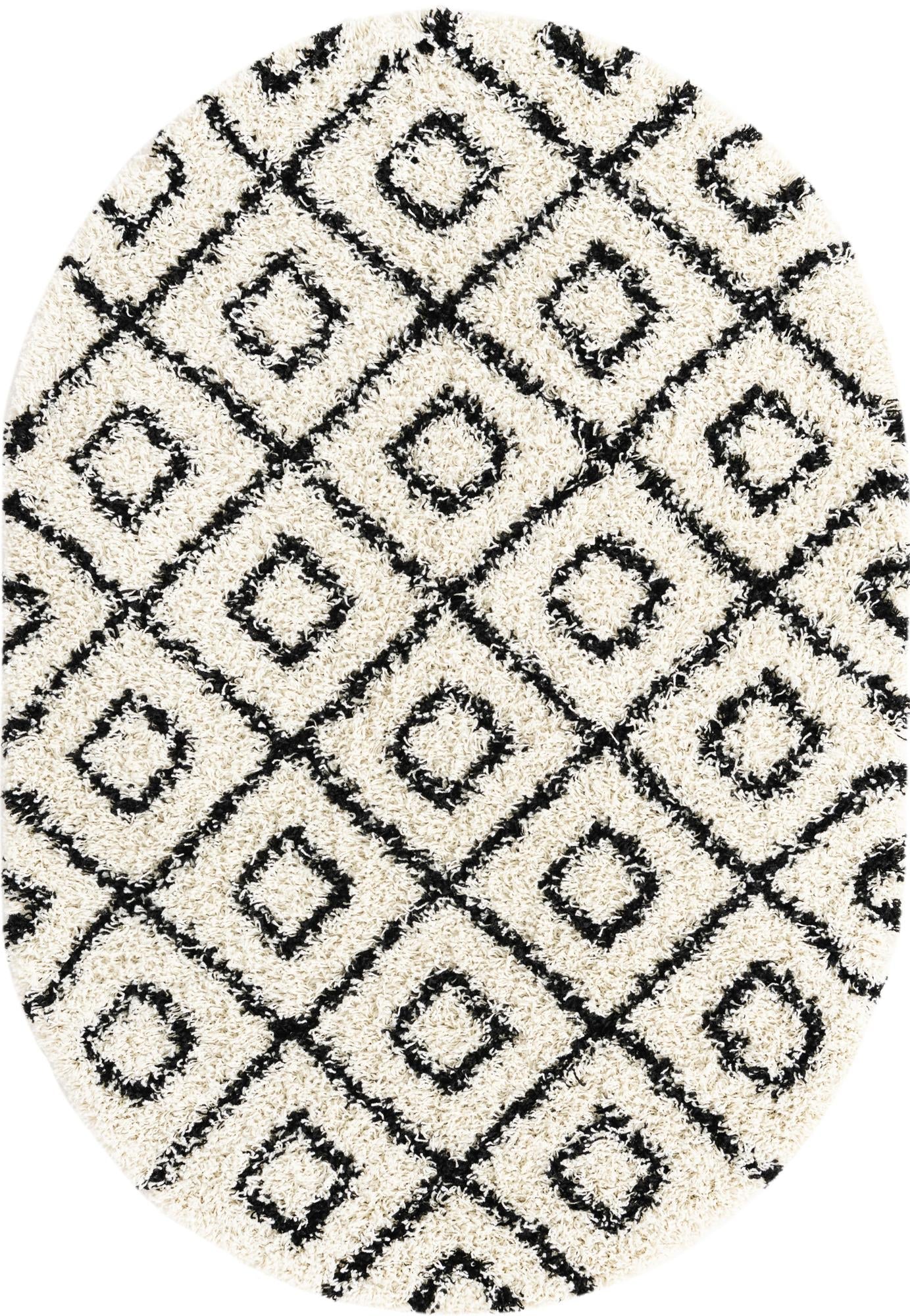 White and Black 4' x 6' Trellis Shag Oval Area Rug Thick Soft Touch Fluffy & Plush Shaggy Pile