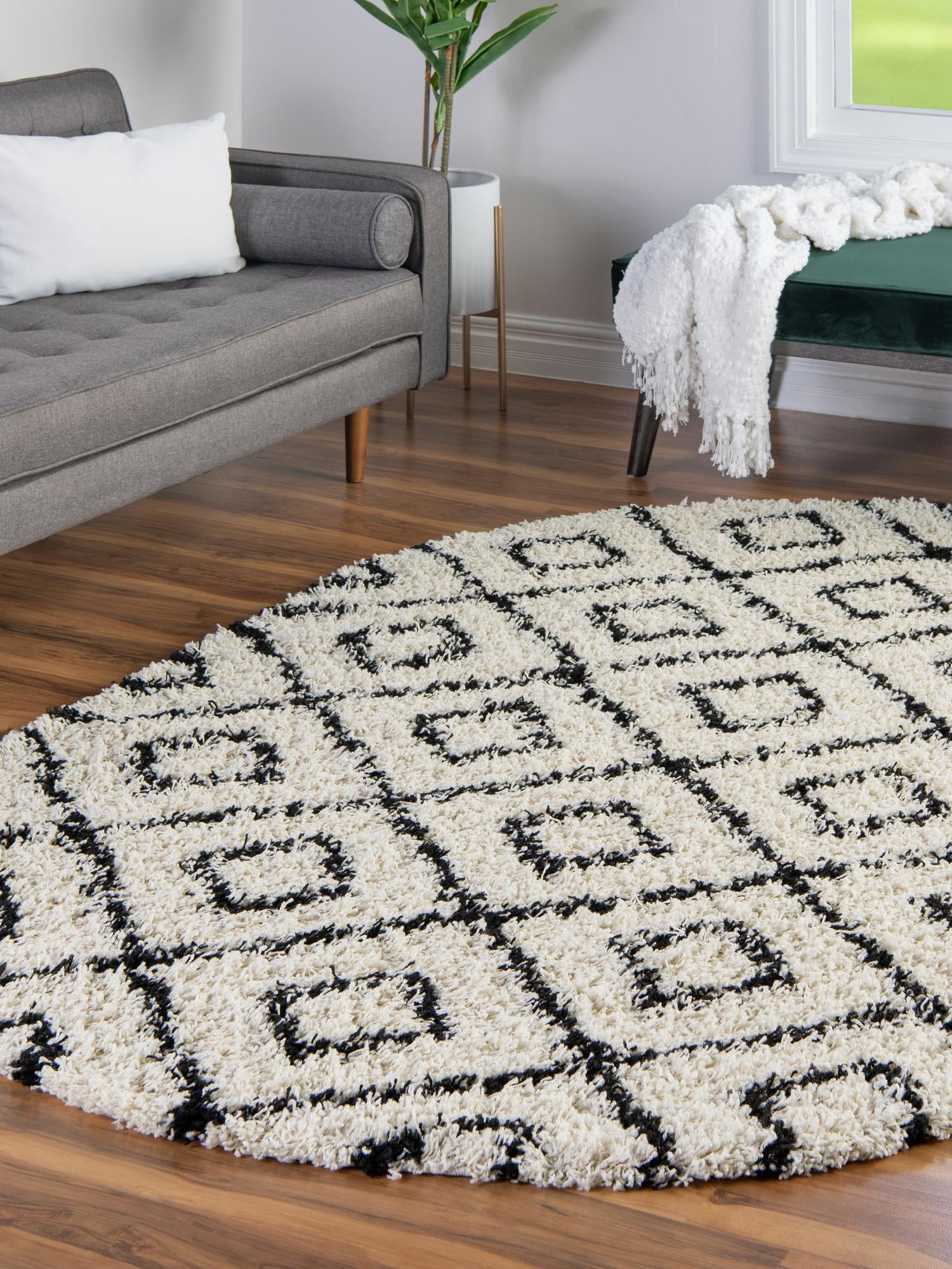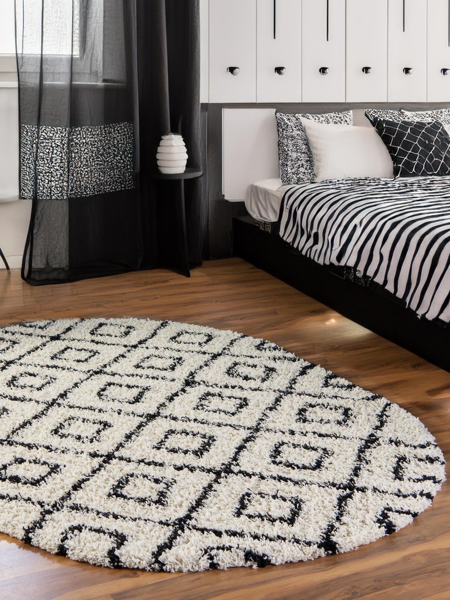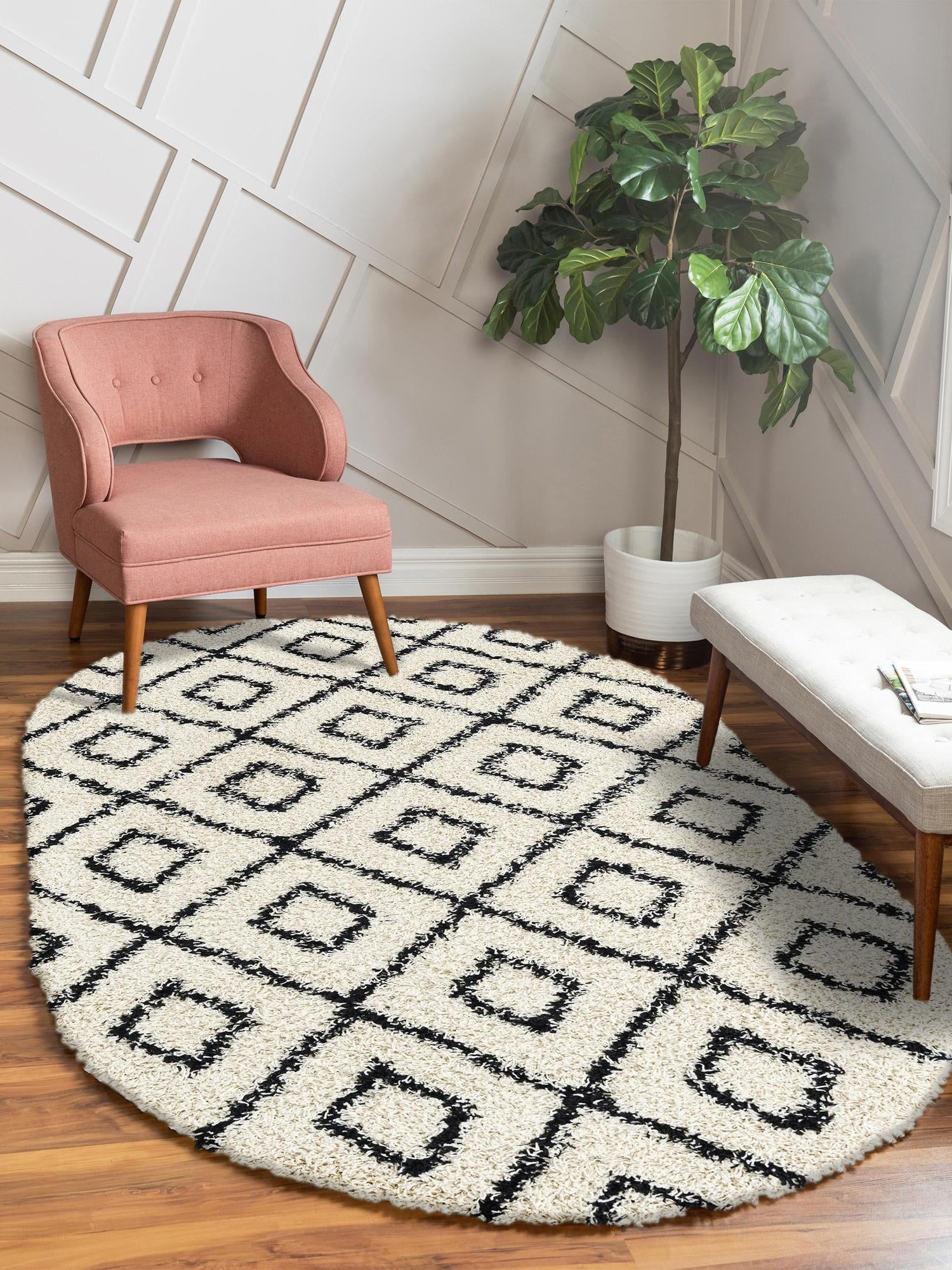 White and Black 4' x 6' Trellis Shag Oval Area Rug Thick Soft Touch Fluffy & Plush Shaggy Pile