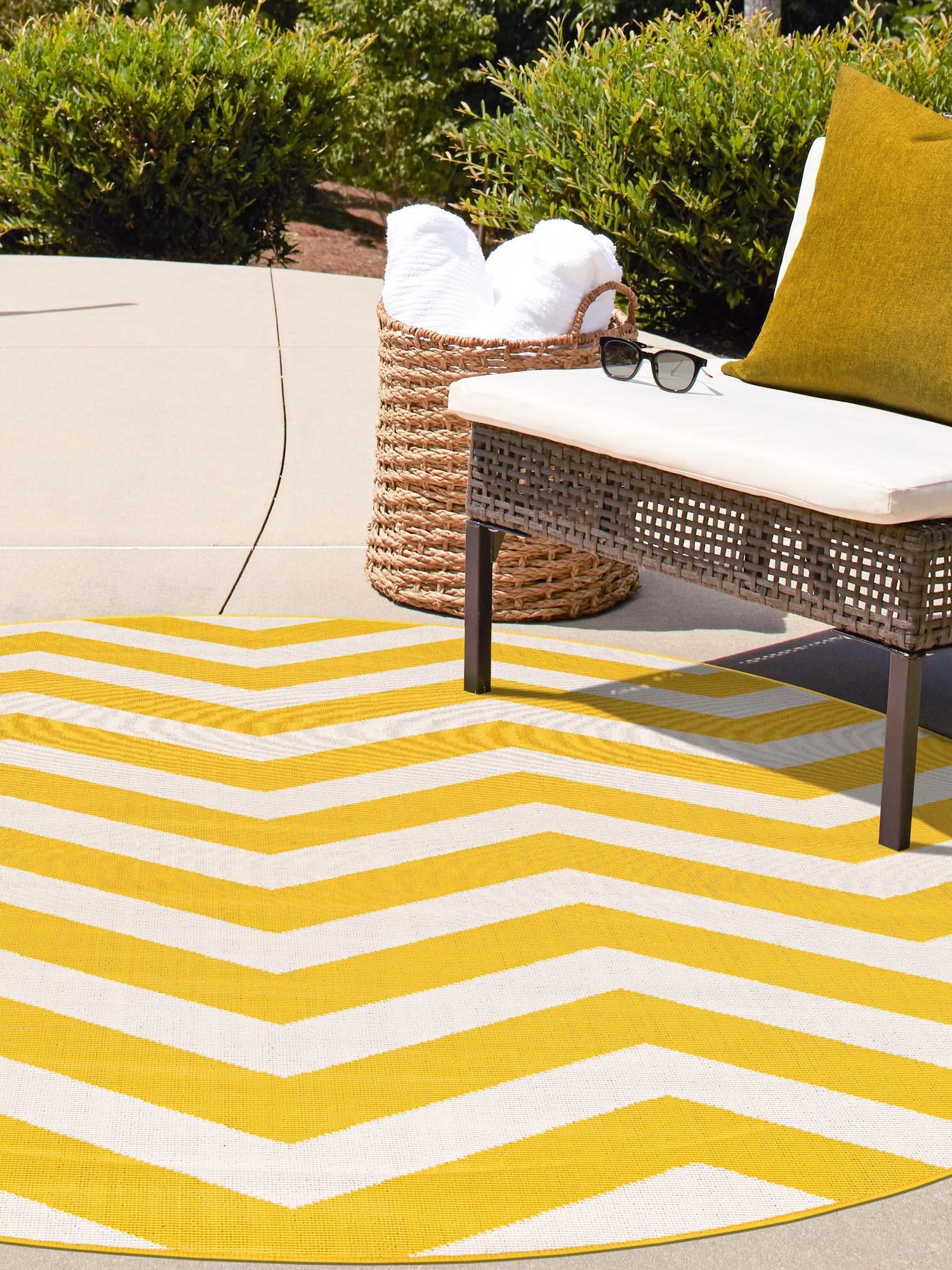 Yellow 7' 1 x 7' 1 Outdoor Coastal Round Area Rug Weather Resistant for Patio, Deck, Terrace, Balcony, Porch